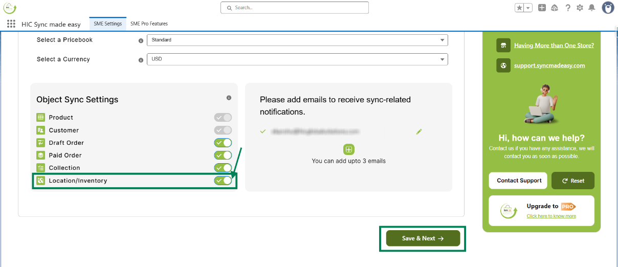 Step 2: On the "Shopify Store Setup" page, scroll down and in "Object Sync Settings", make sure the "Location/Inventory" toggle is enabled. Then click "Save & Next".