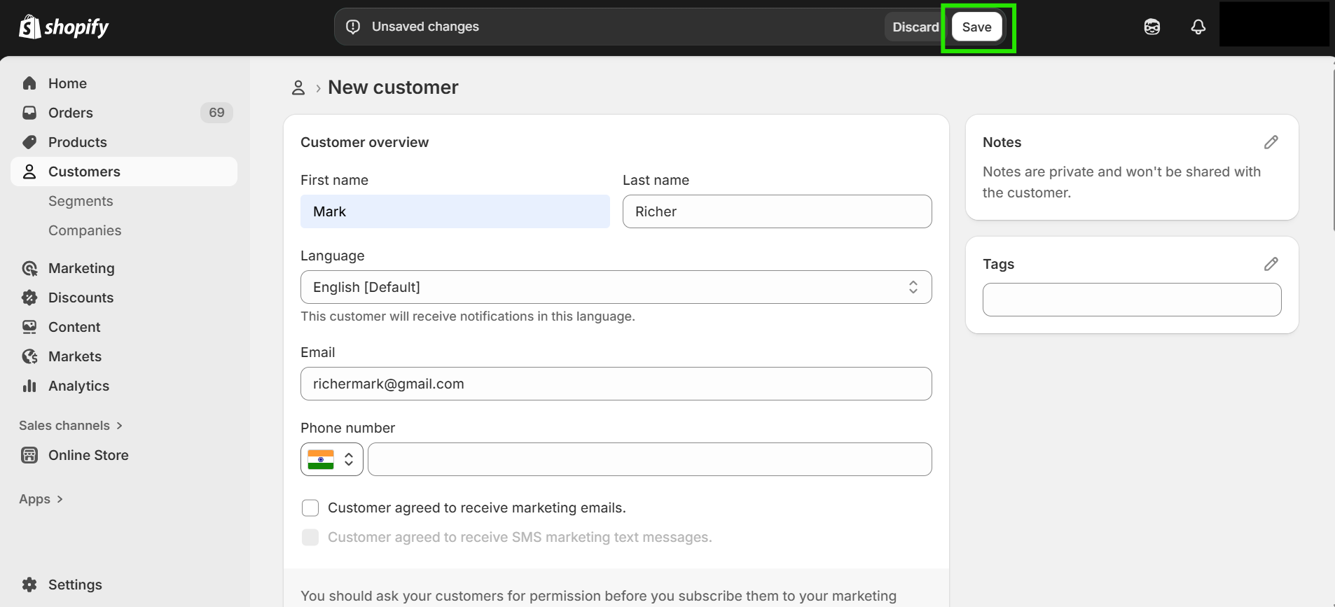 Step 4: Go to your Shopify Store and create a new Customer by clicking “Add Customer”. Fill the required information and click on “Save”.