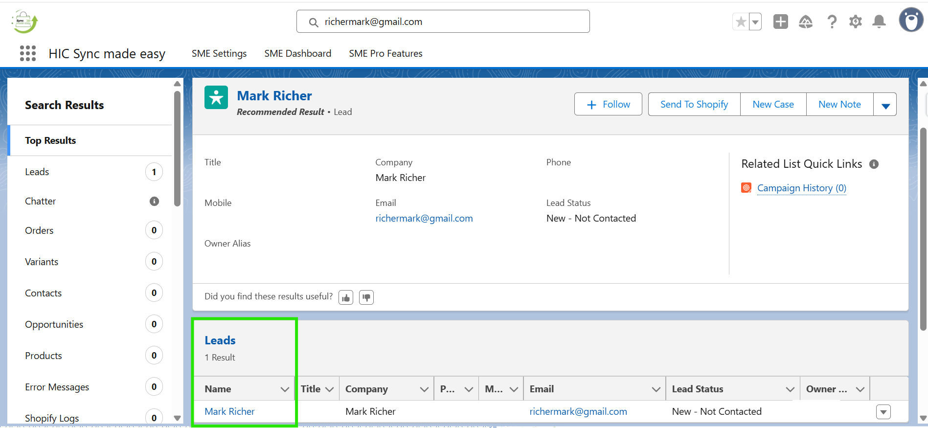 Step 5: Copy the Customer Email or Shopify ID, then paste it into the Salesforce Global Search to find the record. A new "Lead” will be Successfully Created in Salesforce.