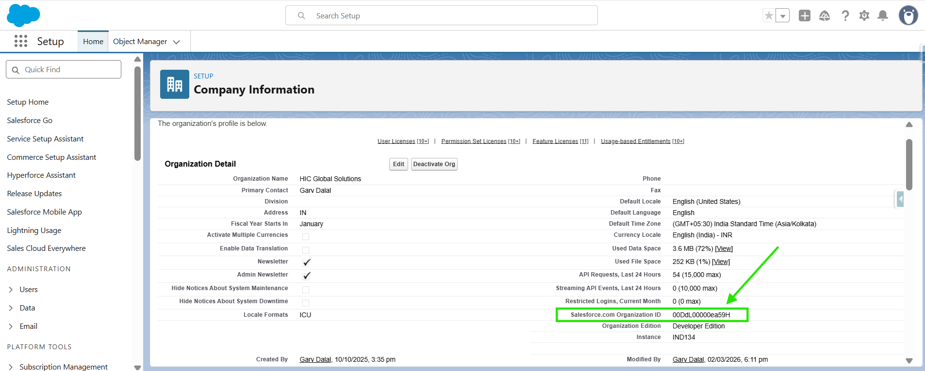 Step 2: Open Company Information and copy the Organization ID to share, starting with '00D'.