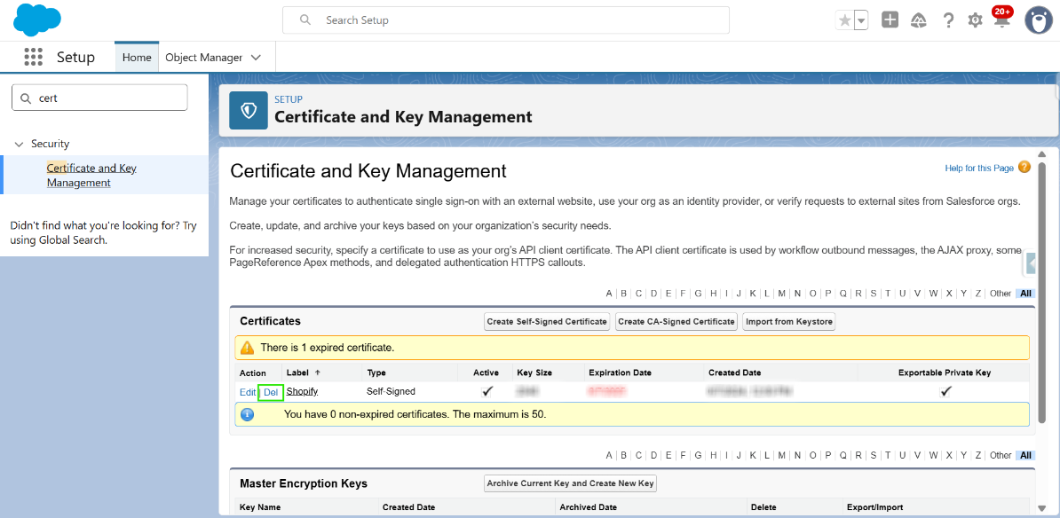 Step 3: Locate the certificate named "Shopify" and click Delete.