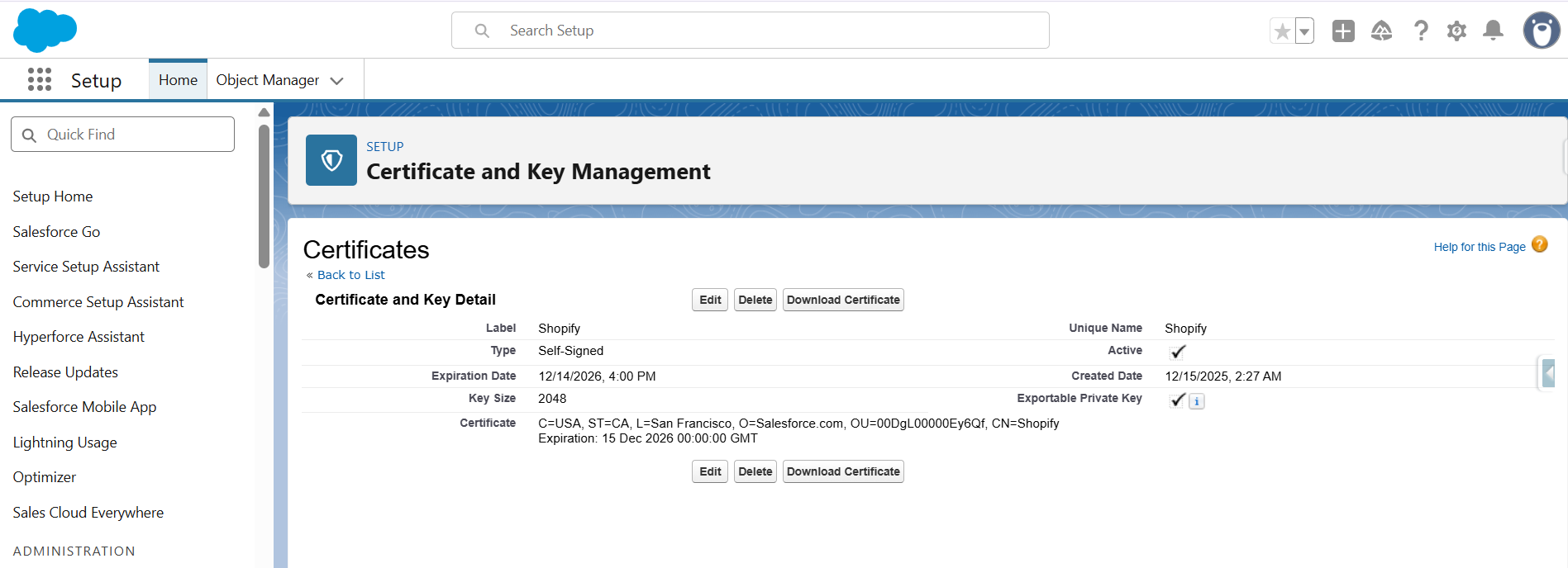 This issue occurs when the Shopify self-signed certificate in your Salesforce org has expired. To resolve this, you must delete the expired certificate and create a new one using the exact same name: “Shopify.”