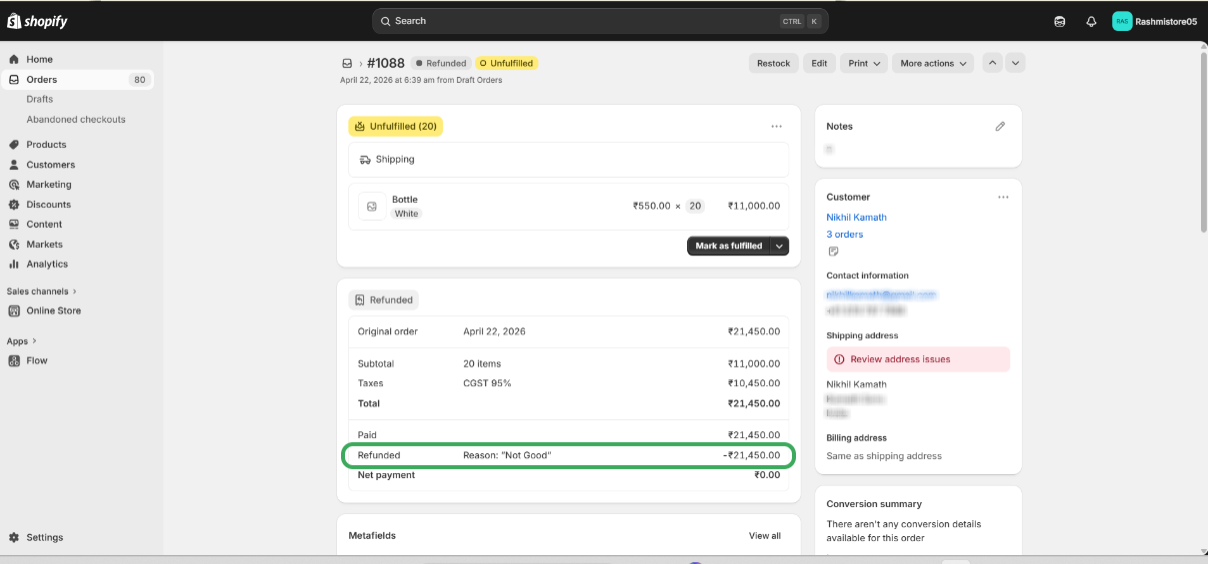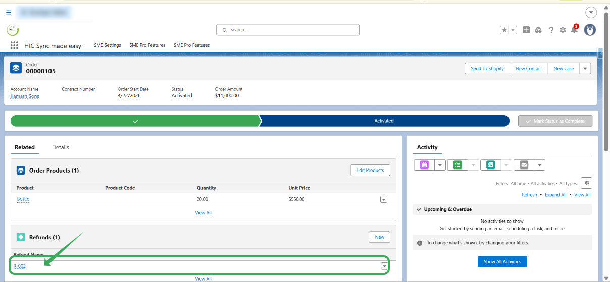 Step 1: Ensure the Refund sync feature is Activated in Salesforce, then Order is refunded from the shopify store.