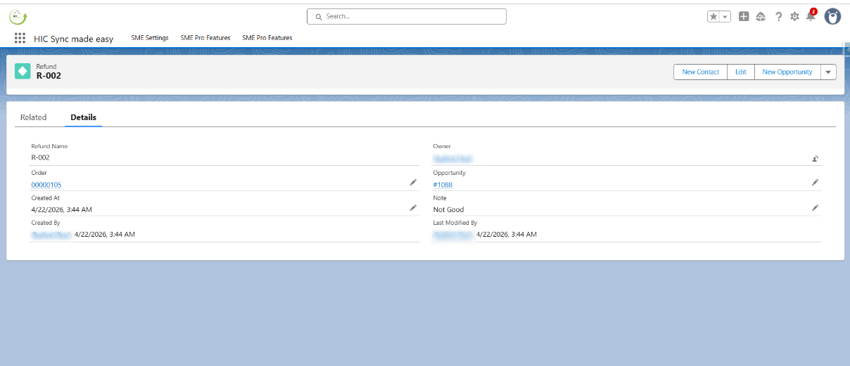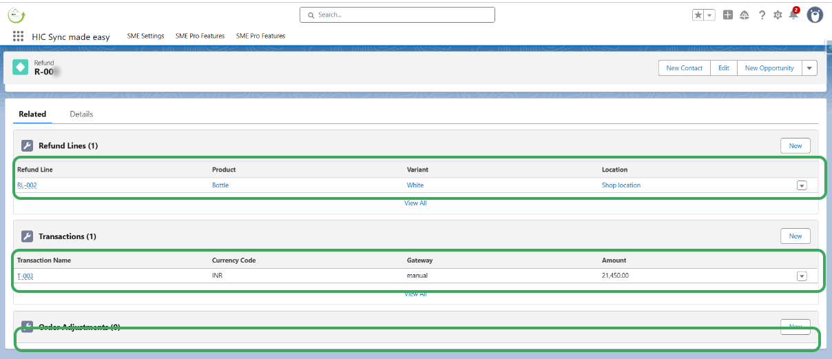 Step 4: Open the related lists, and observe refund line, transaction and order adjustment .