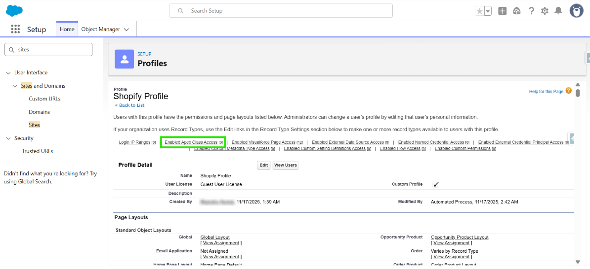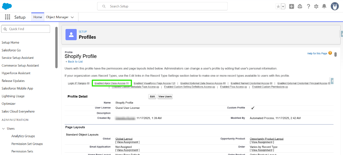 Step 7: On the Profile page, verify that the Apex class has been added to the Enabled Apex Class Access section.