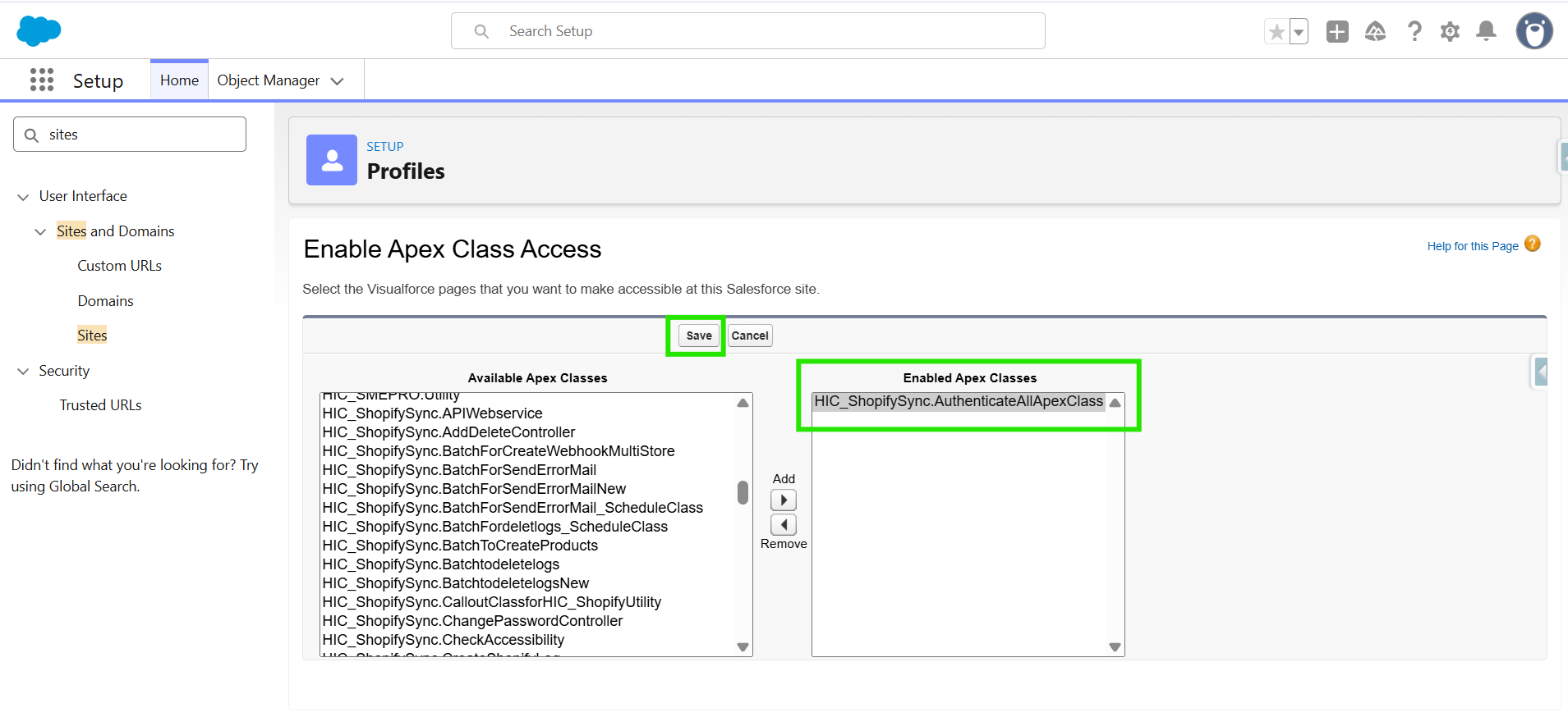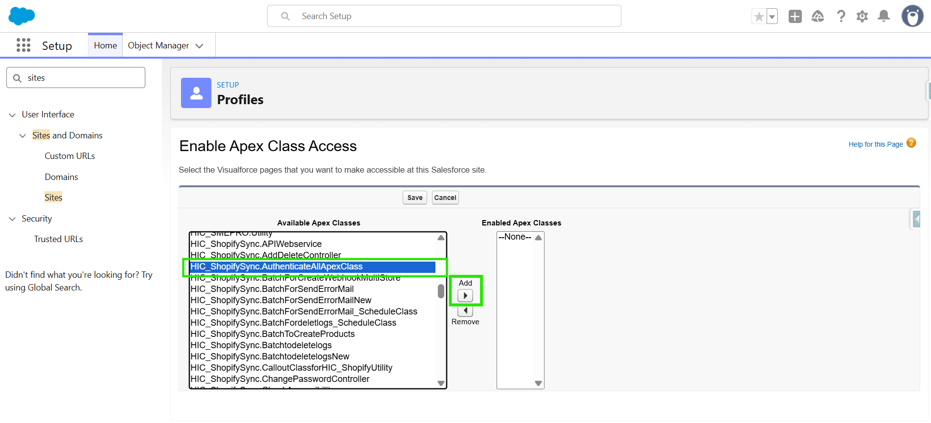 Step 5: You will be navigated to the Enable Apex Class access page. Here, select “HIC_ShopifySync.AuthenticateAllApexClass” then click on “ADD”.