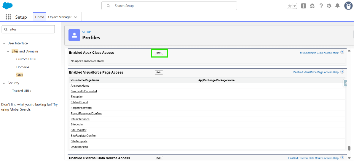 Step 3: This will bring you to the Profile page. Here, click on “Enabled Apex Class Access”.