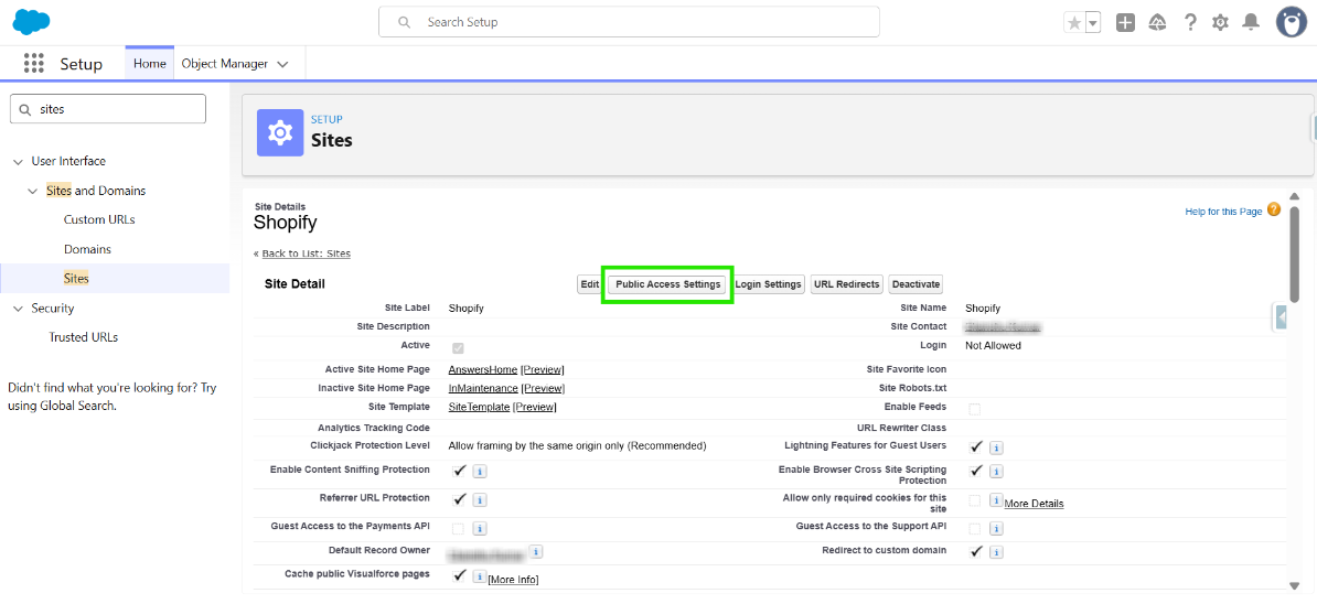 Step 2: It will redirect you to the Salesforce site page, where you can view the site details. Click on "Public Access Settings".