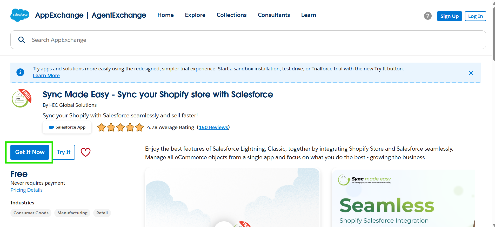 To Begin, Search Sync Made Easy on Salesforce AppExchange and click Get It Now to begin installation.