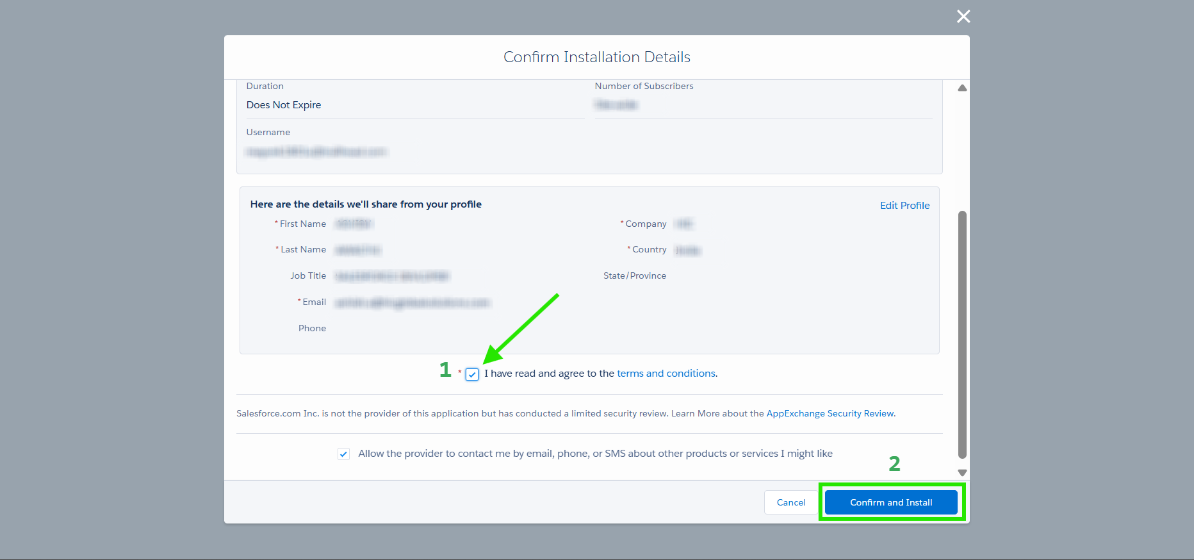 Step 5: You will now be redirected to a confirmation web page to confirm installation details. Accept the terms and conditions by checking the box, then Click Confirm and Install to continue.
