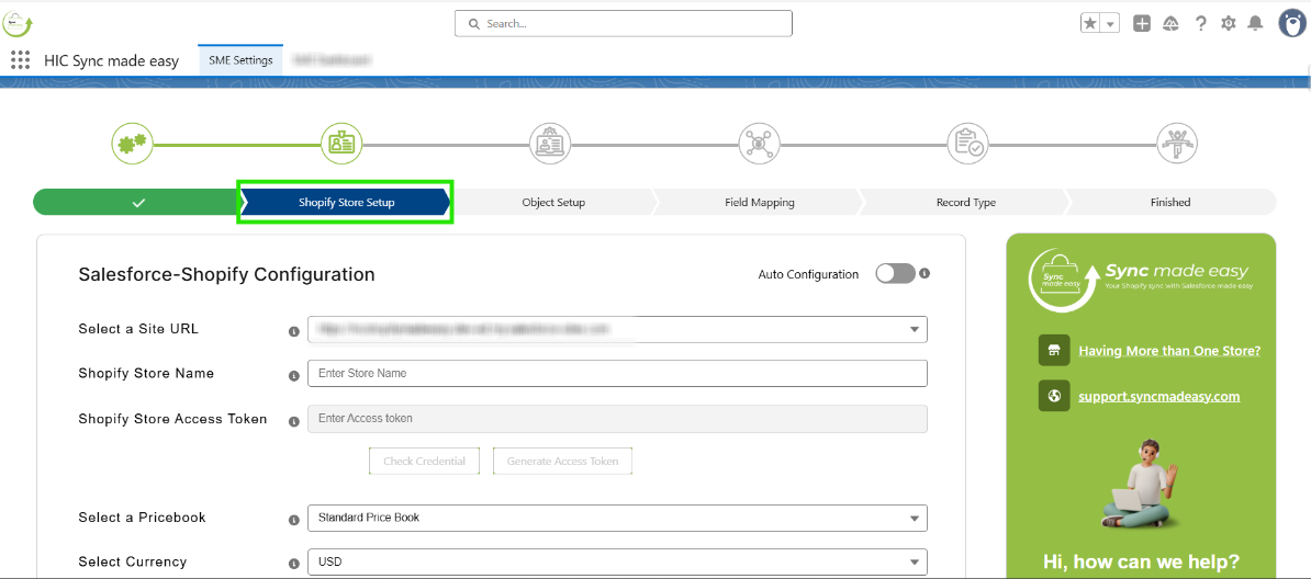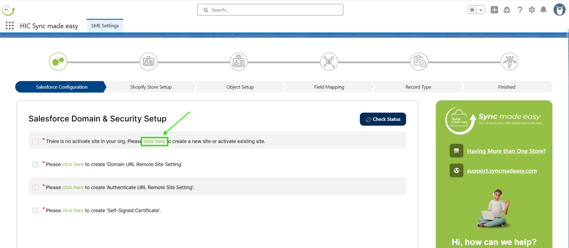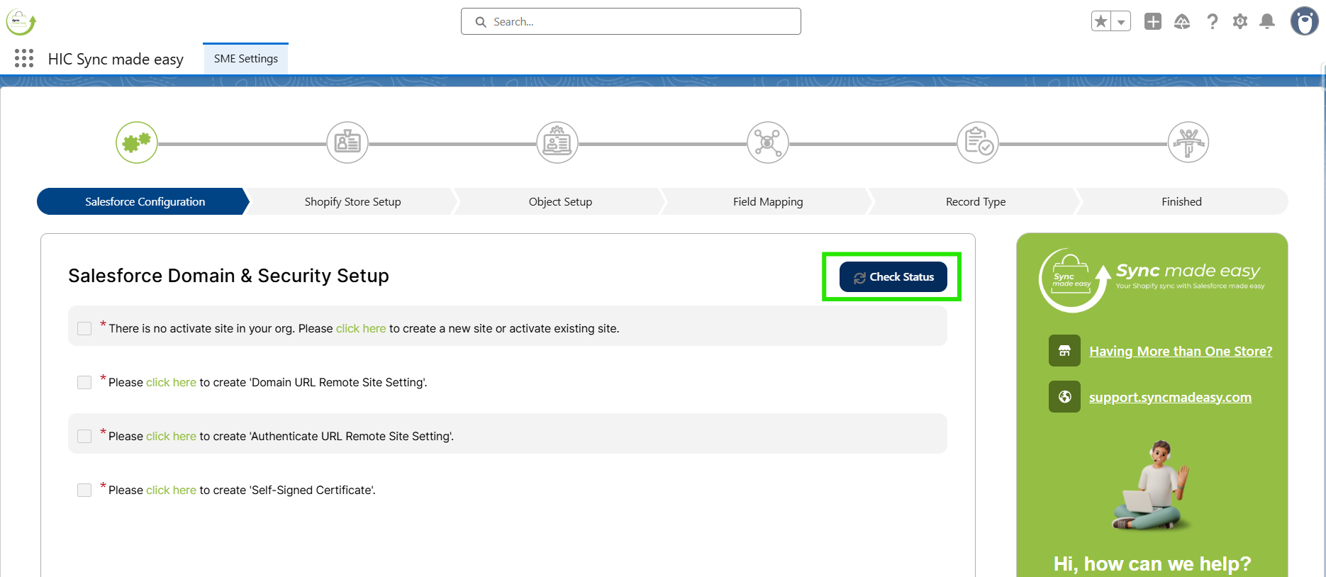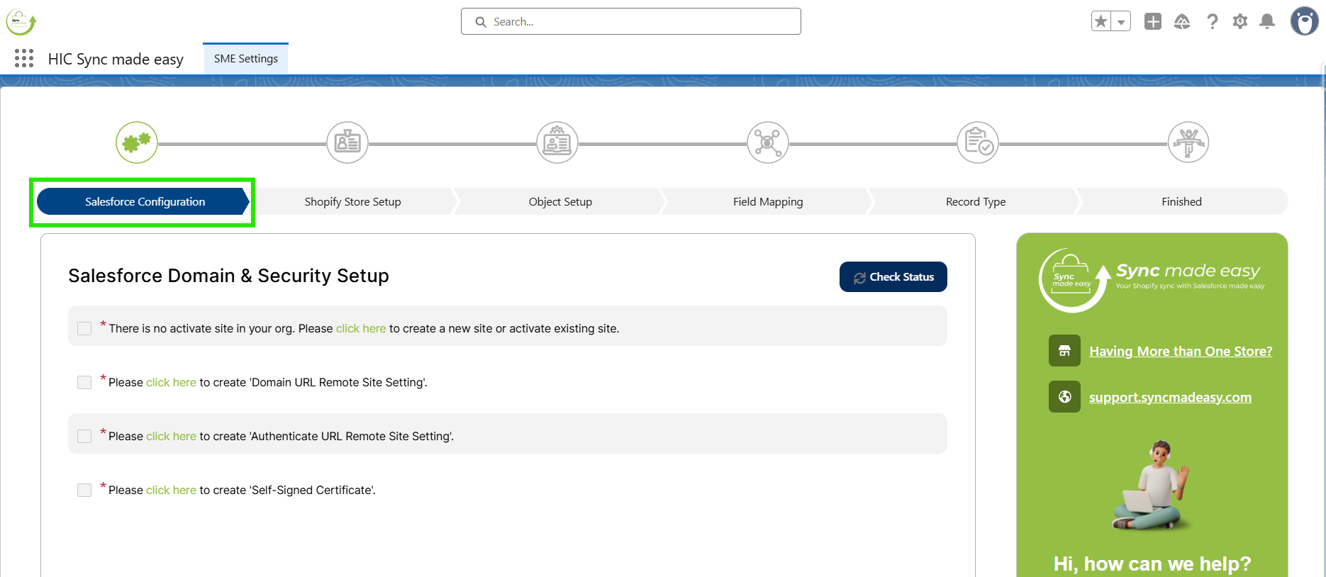 Again, Go back to the Salesforce Configuration page, click on Check Status. Once you click on it, you will be taken to the next step (Shopify Store Setup).