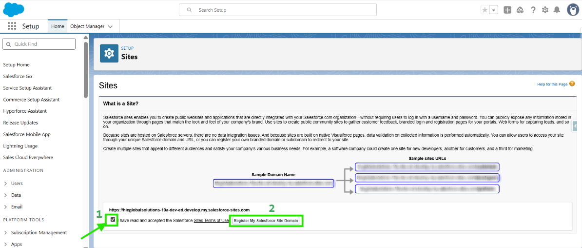 Check the checkbox ☑️ next to I have read and accepted the Salesforce Site’s Terms and Conditions. Then, click Register My Salesforce Site Domain to finish registration.