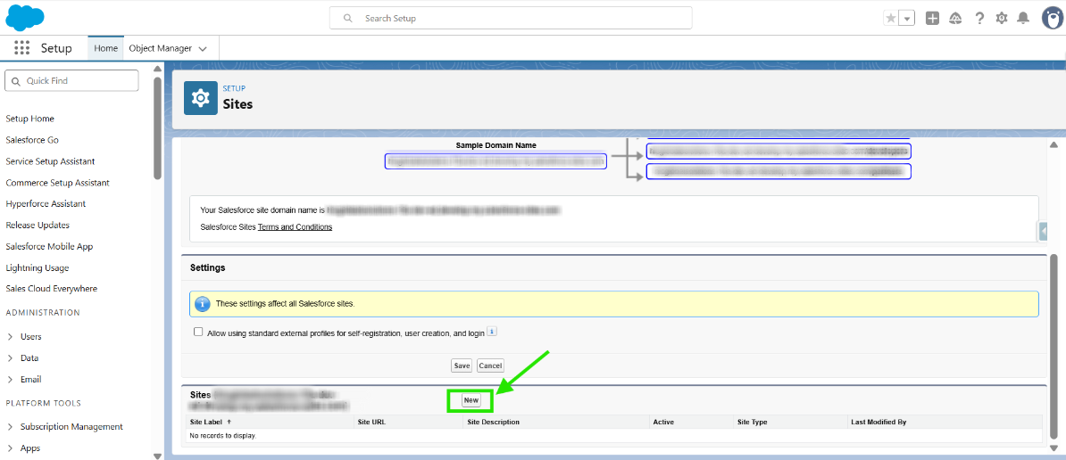 After a while, refreshing the page should display your Salesforce Site Domain Name. Click on “New” to create a new site.