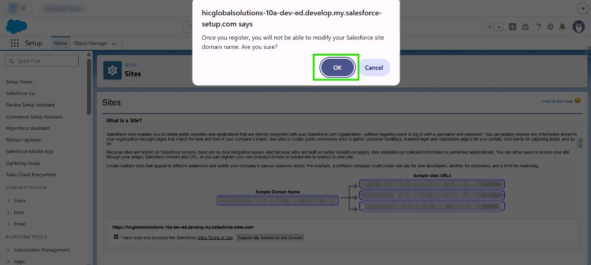 The Domain Name for your Salesforce Site will be immutable once registered and must be chosen carefully before proceeding any further.