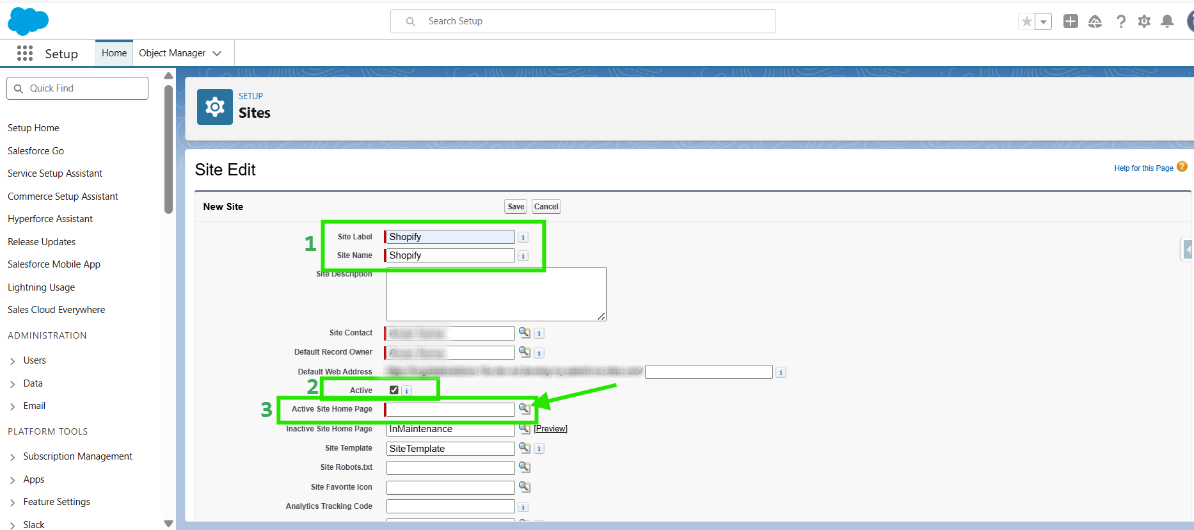 Now, on the Site Edit Page, fill in the mandatory fields marked in Green and tick the checkbox next to ‘Active’ to activate the site. (You only need to enter the Site Label and Site Name. And do not forget to put a tick on the Active Site Checkbox.)