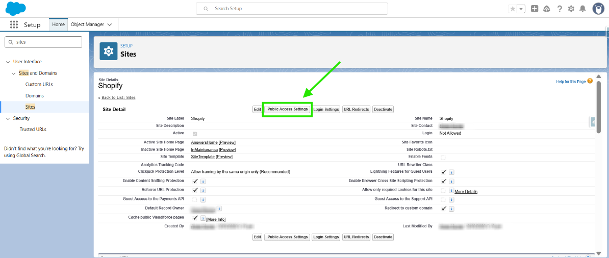 On the following page, you should be able to see the site details. Click on Public Access Settings.