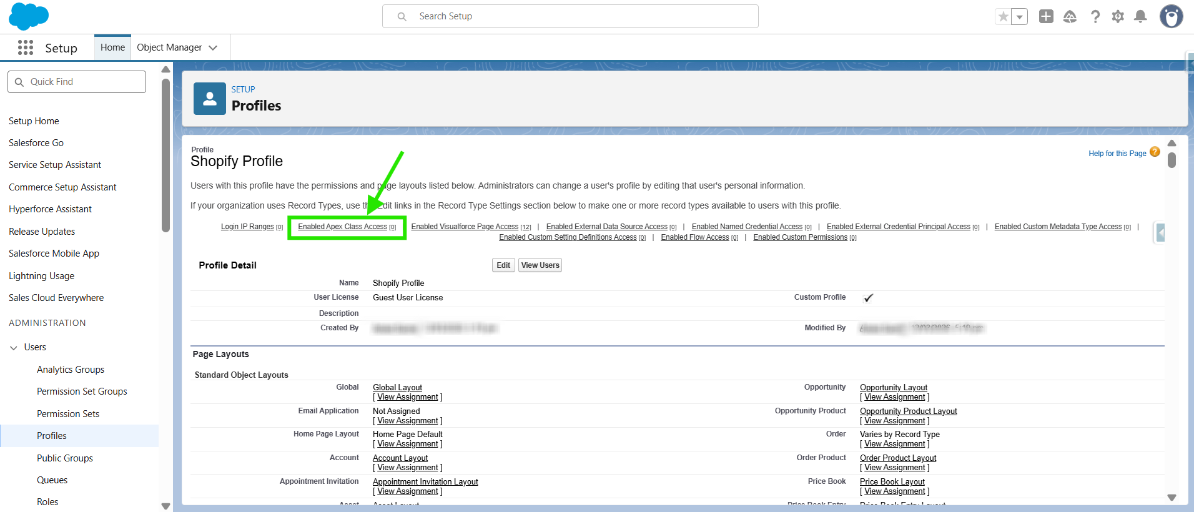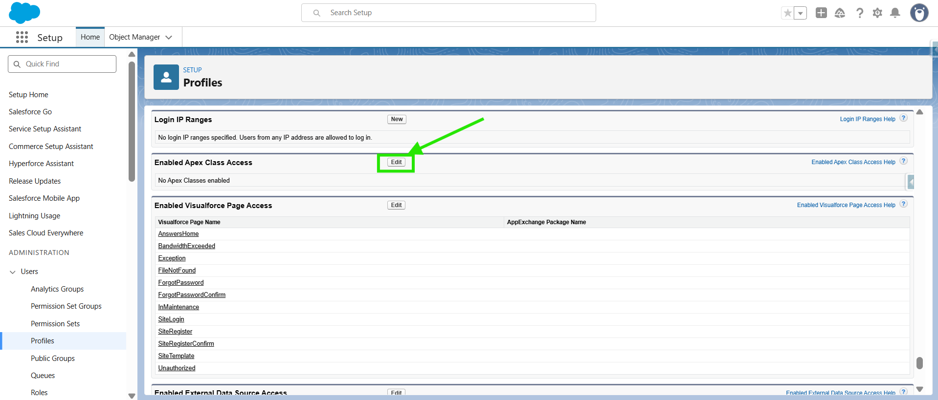 This will bring you to the Profile page. Here, click on "Enabled Apex Class Access” , then click on ‘’Edit".