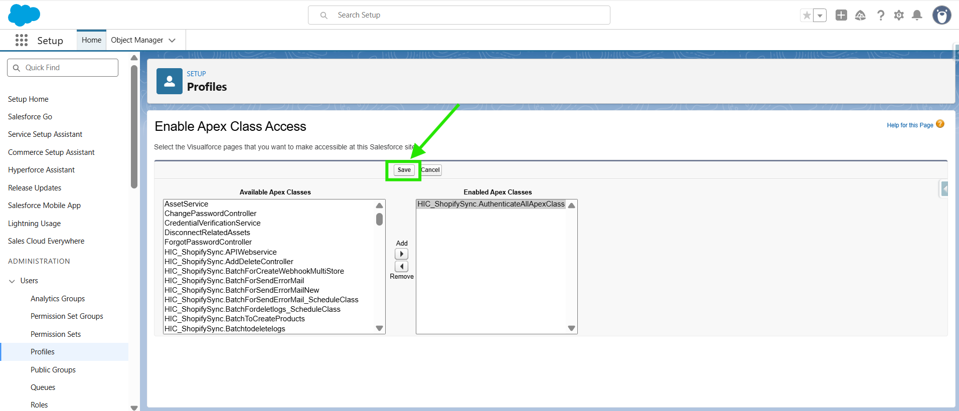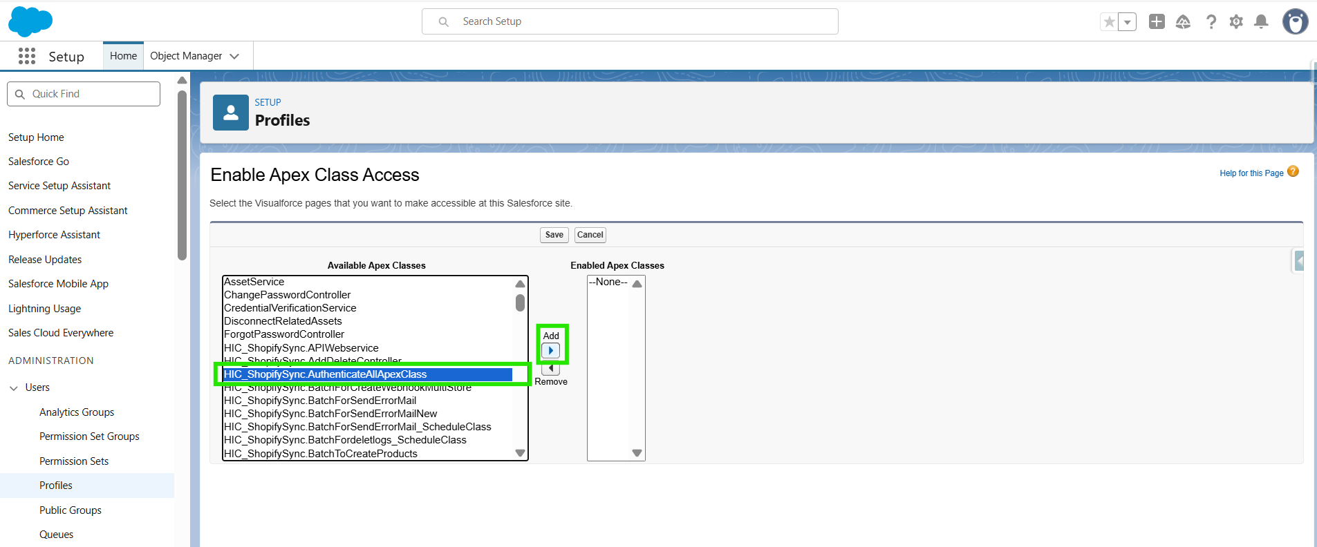 Now, you will be navigate to Enable Apex Class access page. Here, select “HIC_ShopifySync.AuthenticateAllApexClass” then click on ADD .