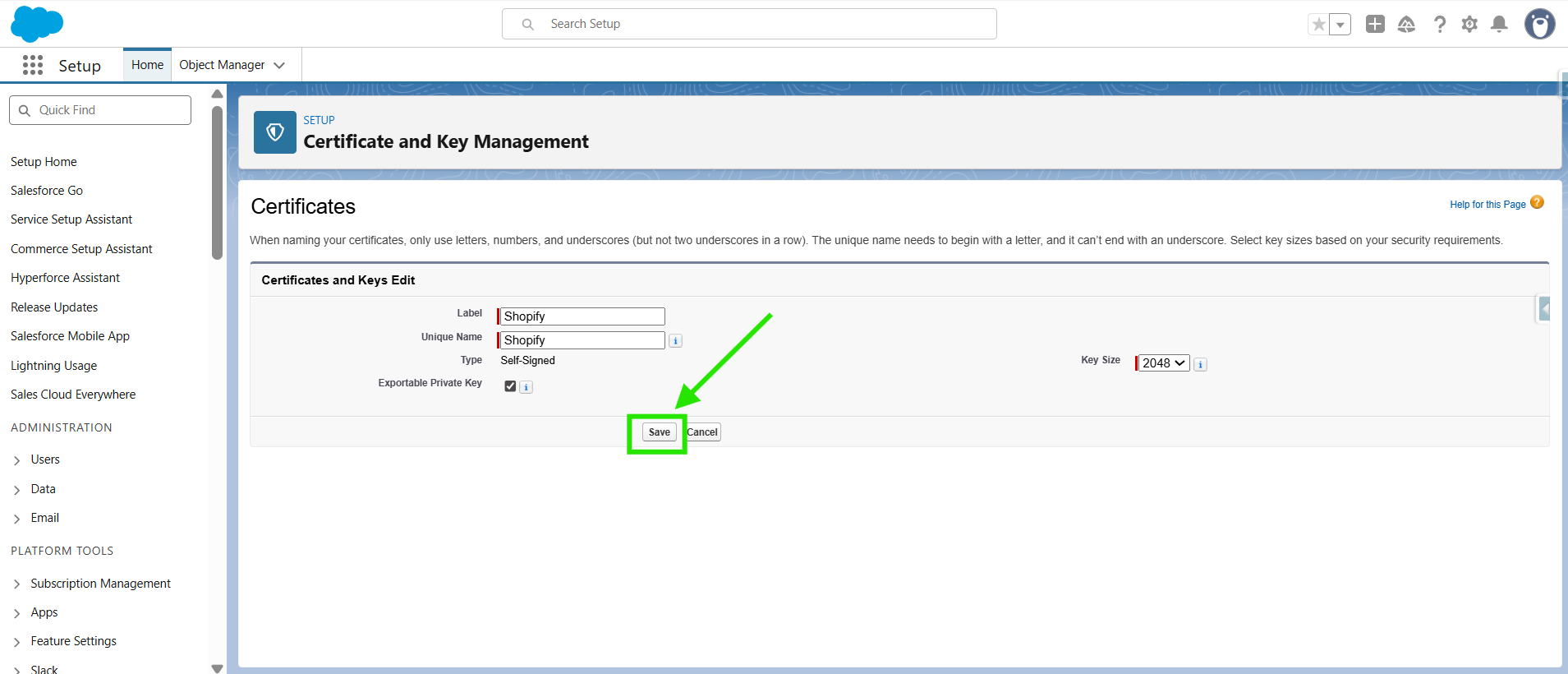 In this step, we will generate a self-signed certificate with the name “Shopify”.