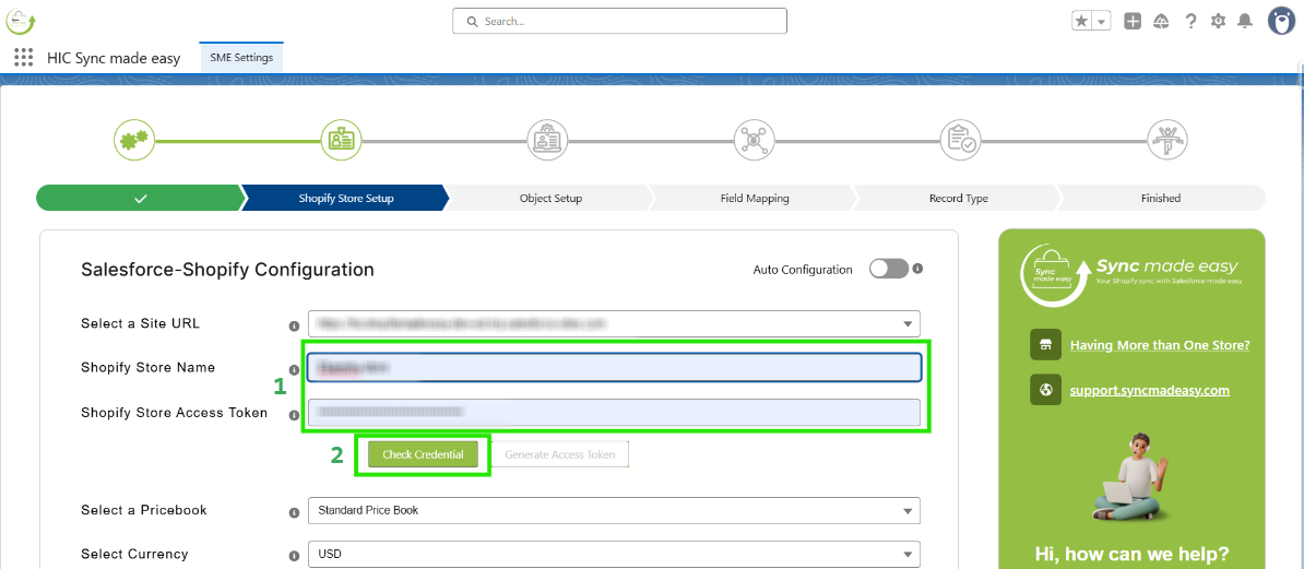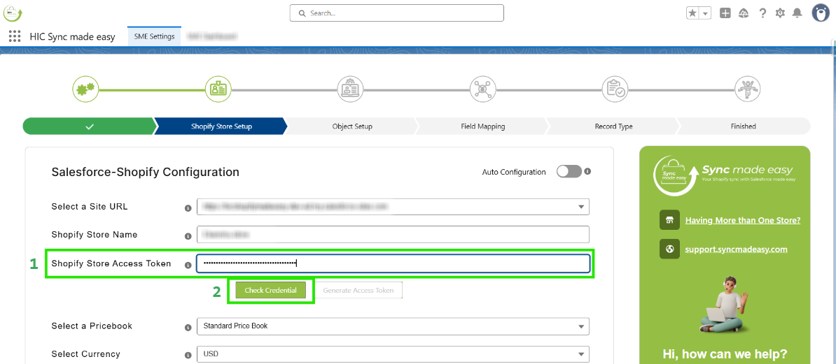 Go back to the Shopify Store Setup page, fill the Shopify store access token, and click on "Check Credential".