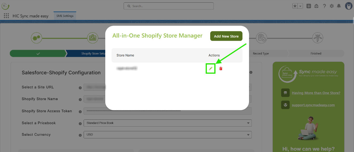 On the All-in-One Shopify Store Manager modal, click the Edit icon for the store you want to edit.
