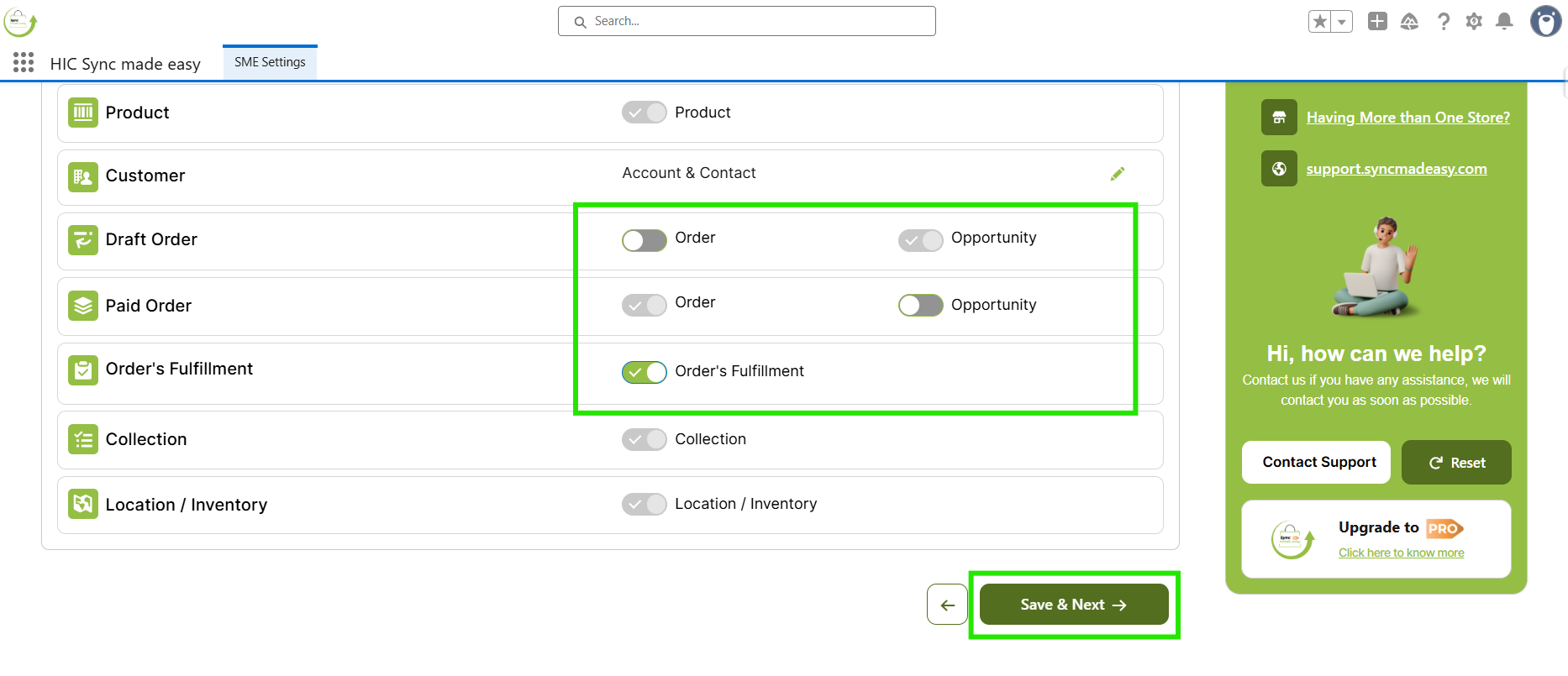 If you do not want to create an Order for Draft Orders, an Opportunity for Paid Orders, or Order's Fulfillment, you can turn off the toggle for these objects. To use the full functionality, keep the default settings enabled. Then click Save & Next.