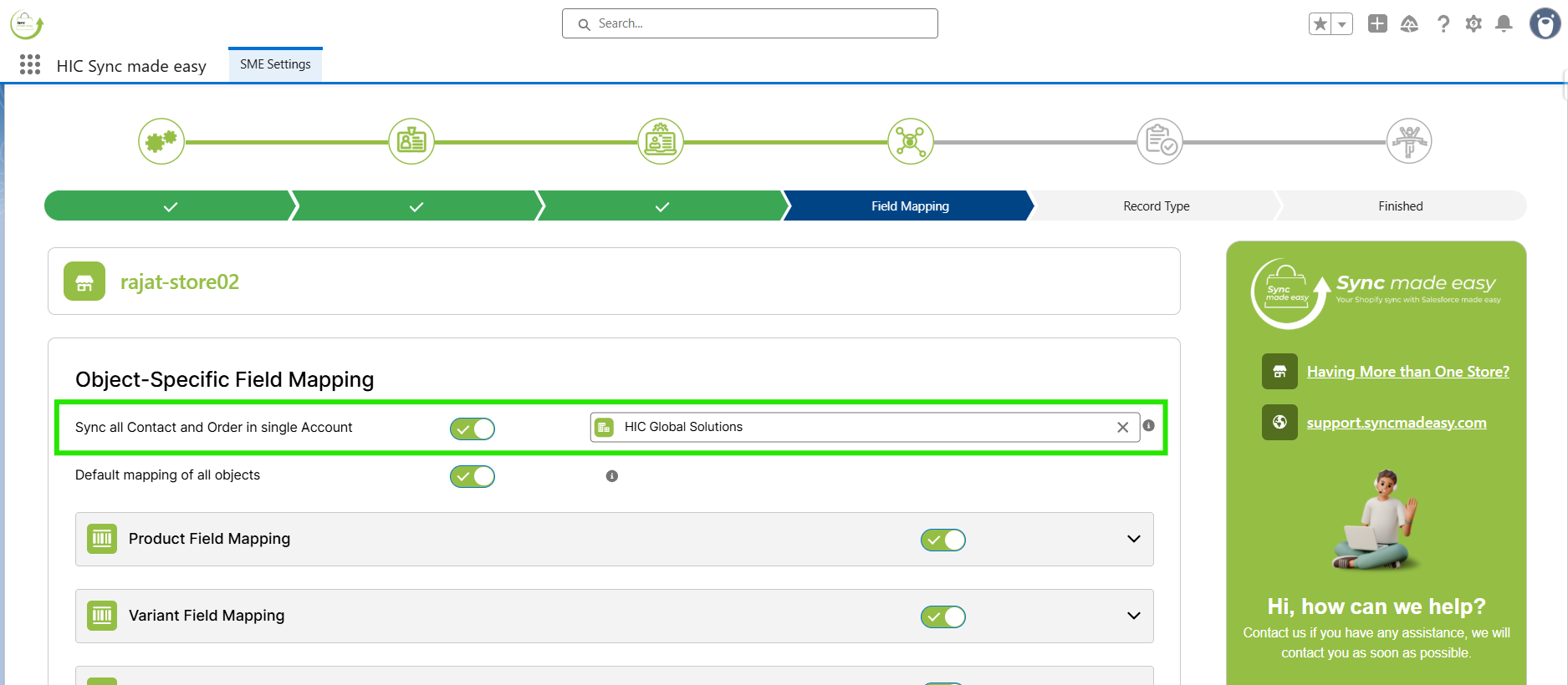 You can also “Sync all Contacts and Orders in a single Account” by enabling the toggle button of “Sync all Contacts and Orders in a single Account” and giving the name of the account you want to sync all your contacts/orders.