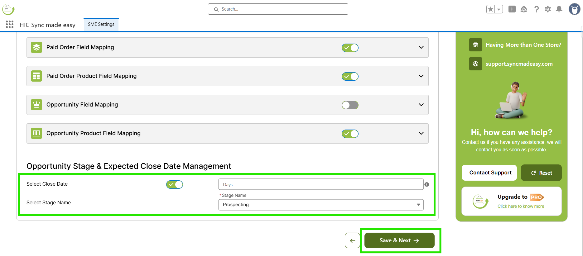 You can also set a Default Close Date and Default Stage for all opportunities. Scroll down to the Opportunity Stage & Expected Close Date Management section at the bottom of the page, enable the toggle button, enter the number of days you want, and select the stage from the "Select Stage Name". Then, click on Save & Next.