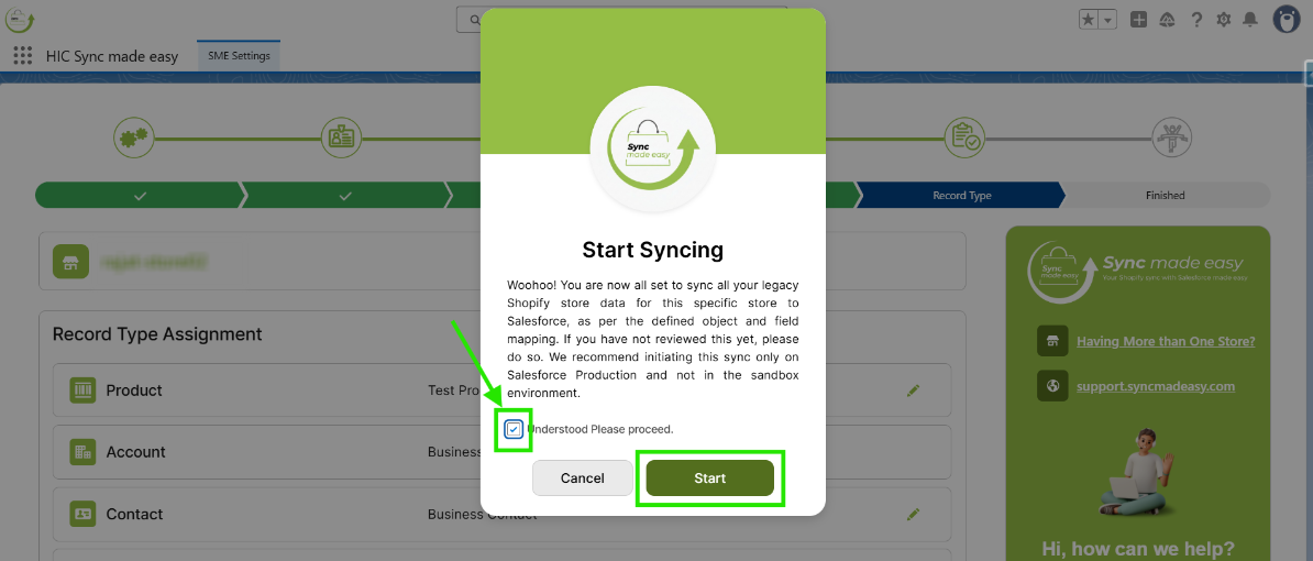 In the Start Syncing pop-up modal, check the “I Understand, Please Proceed” checkbox and then click “Start”.