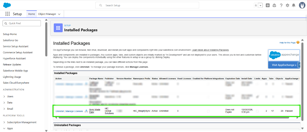 Step 10: After the package is installed, you will be able to view the package at the Installed Packages in Salesforce, where Sync Made Easy will be listed.