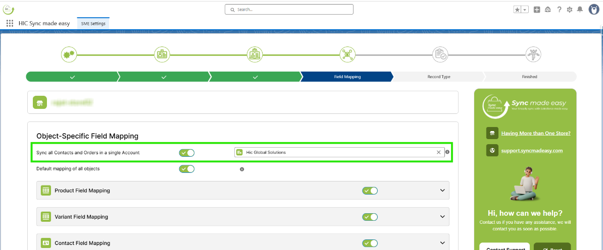 You can also sync all contacts and orders in a single account by enabling the toggle button of “Sync all Contacts and Orders in a single Account” and giving the name of the account you want to sync all your contacts/orders.