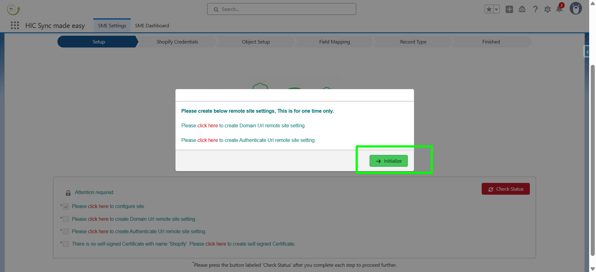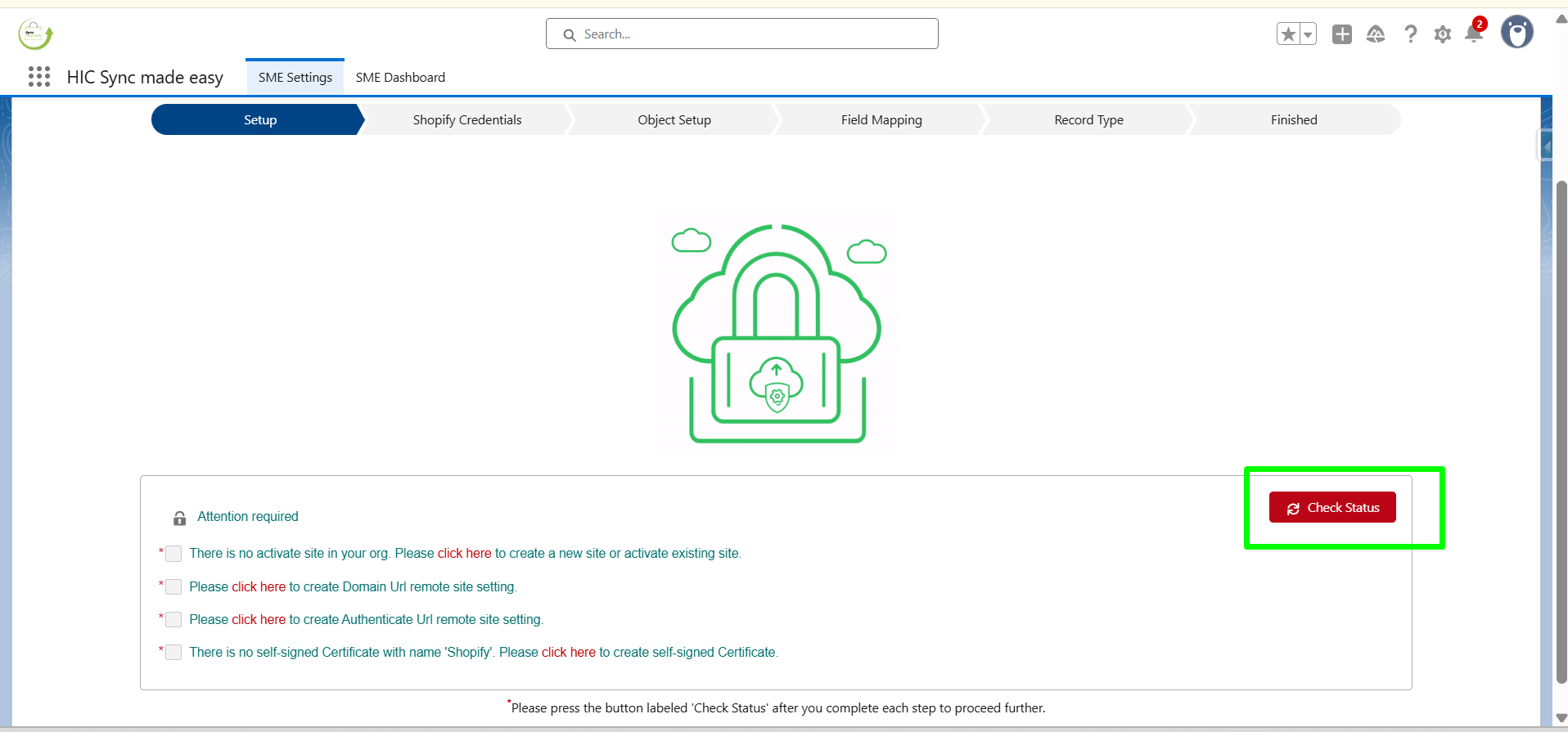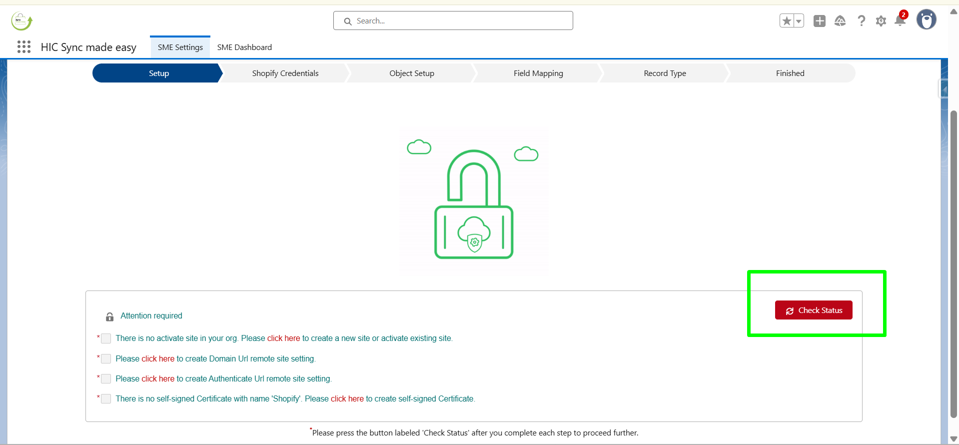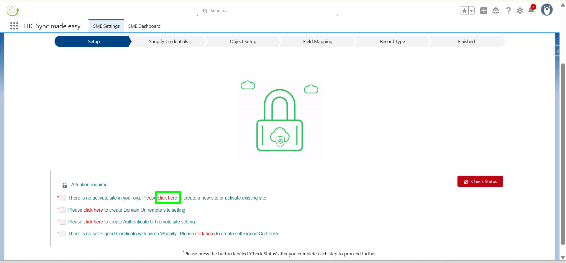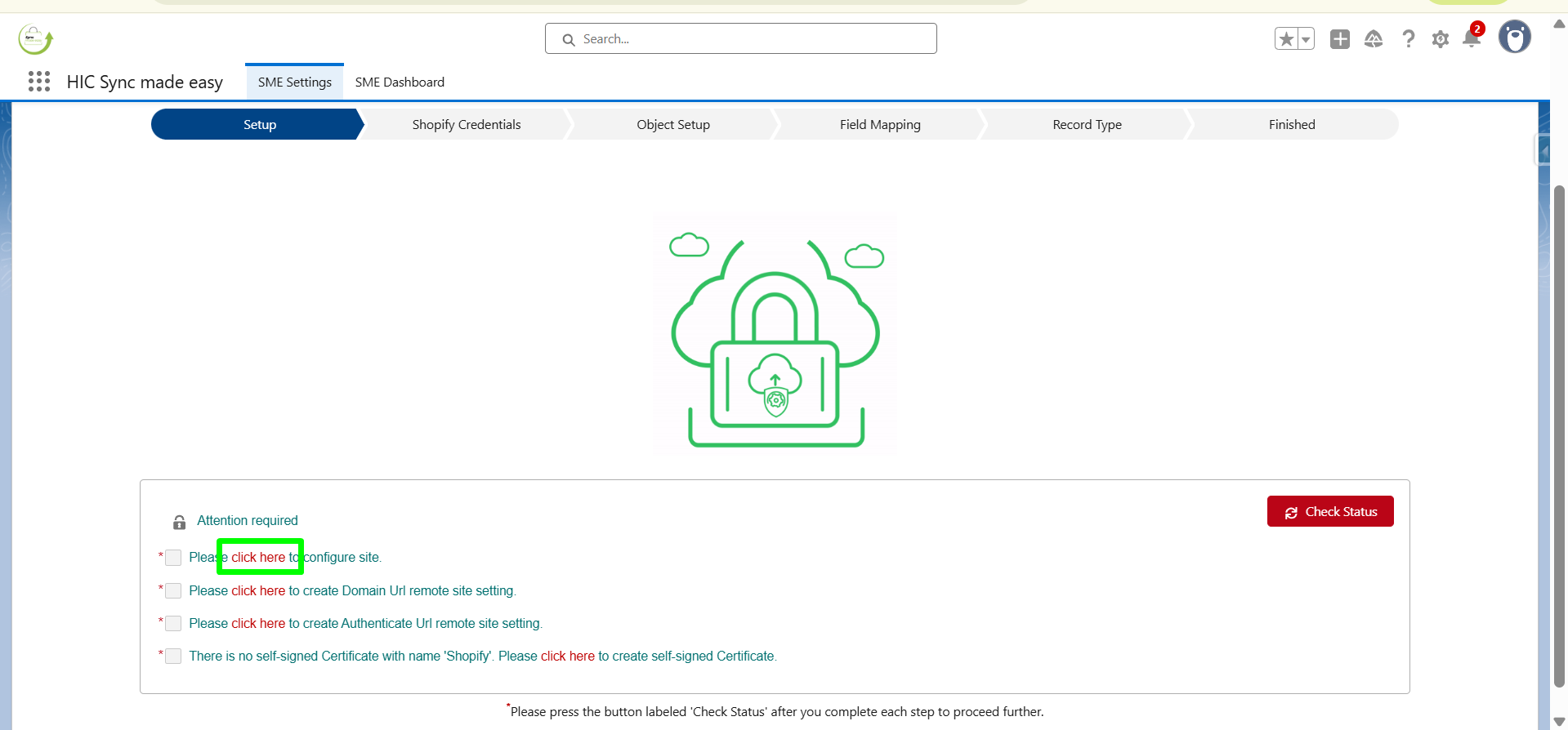 On the setup page, click on Check Status. Once you click on it, you will be taken to the next step (Shopify Credentials).