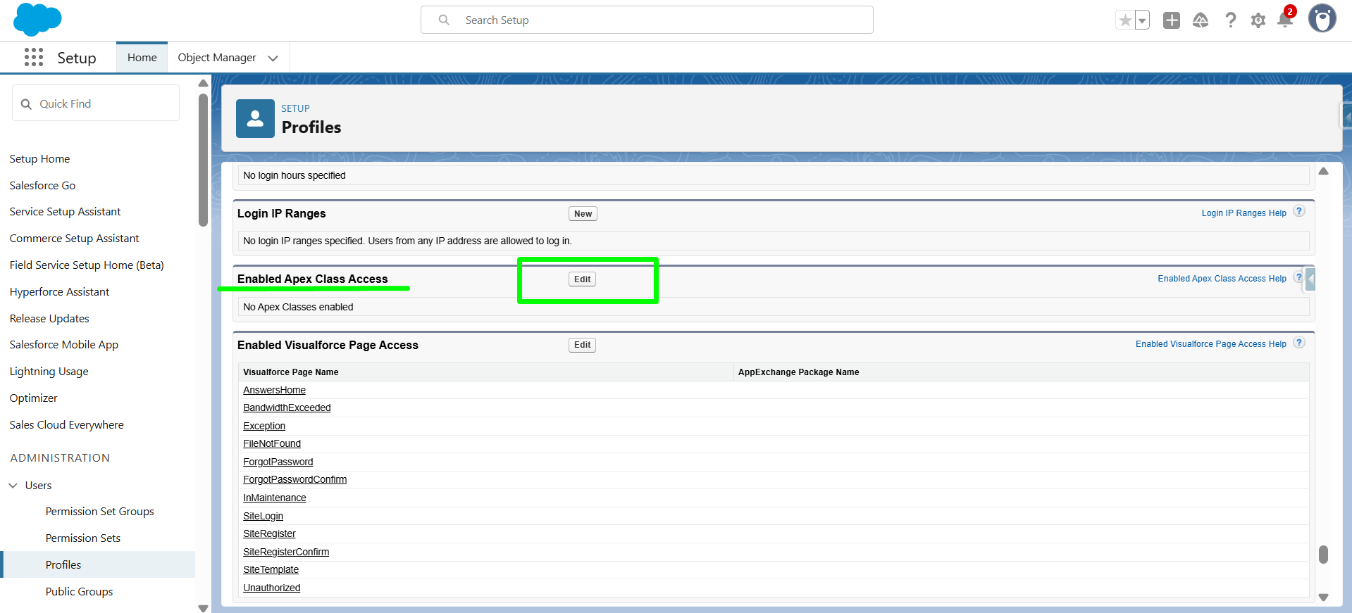 This will bring you to the Profile page. Here, click on "Enabled Apex Class Access” , then click on ‘’Edit".