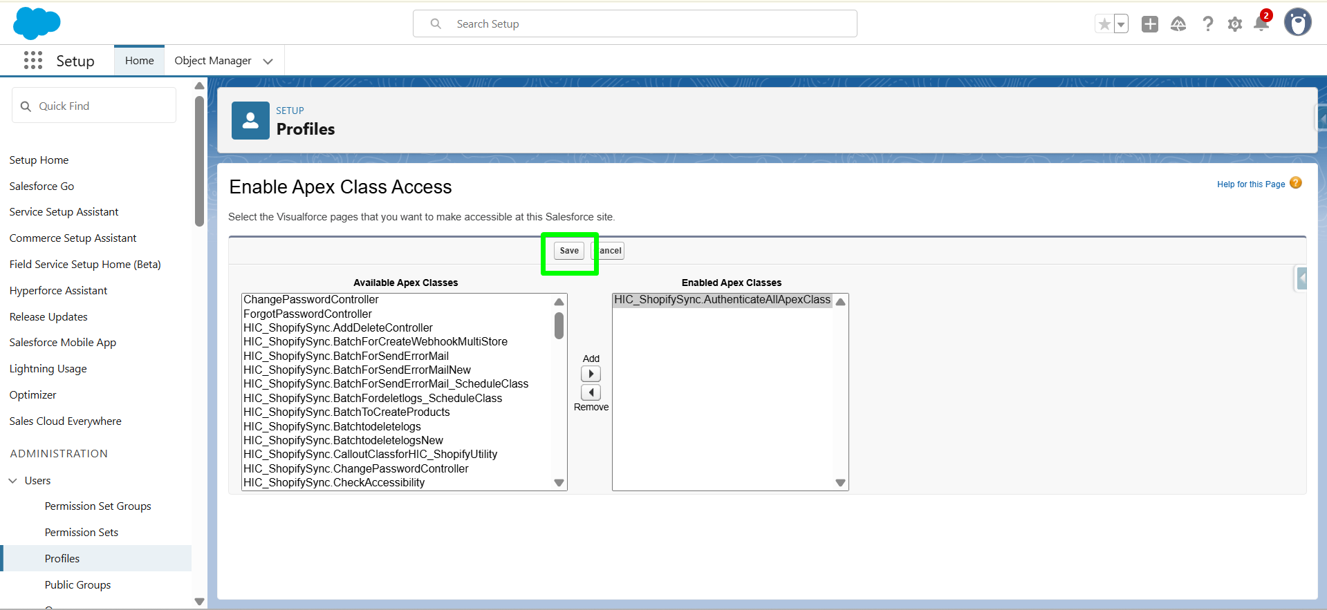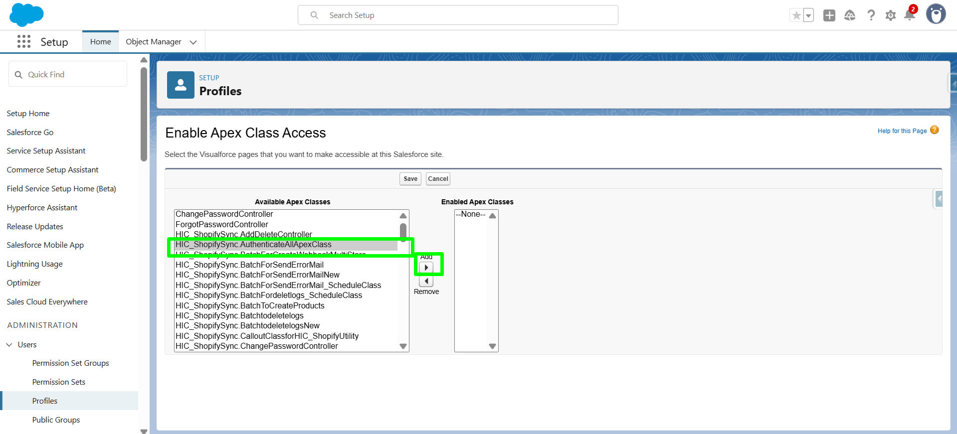 Now, you will be navigate to Enable Apex Class access page. Here, select “HIC_ShopifySync.AuthenticateAllApexClass” then click on ADD .