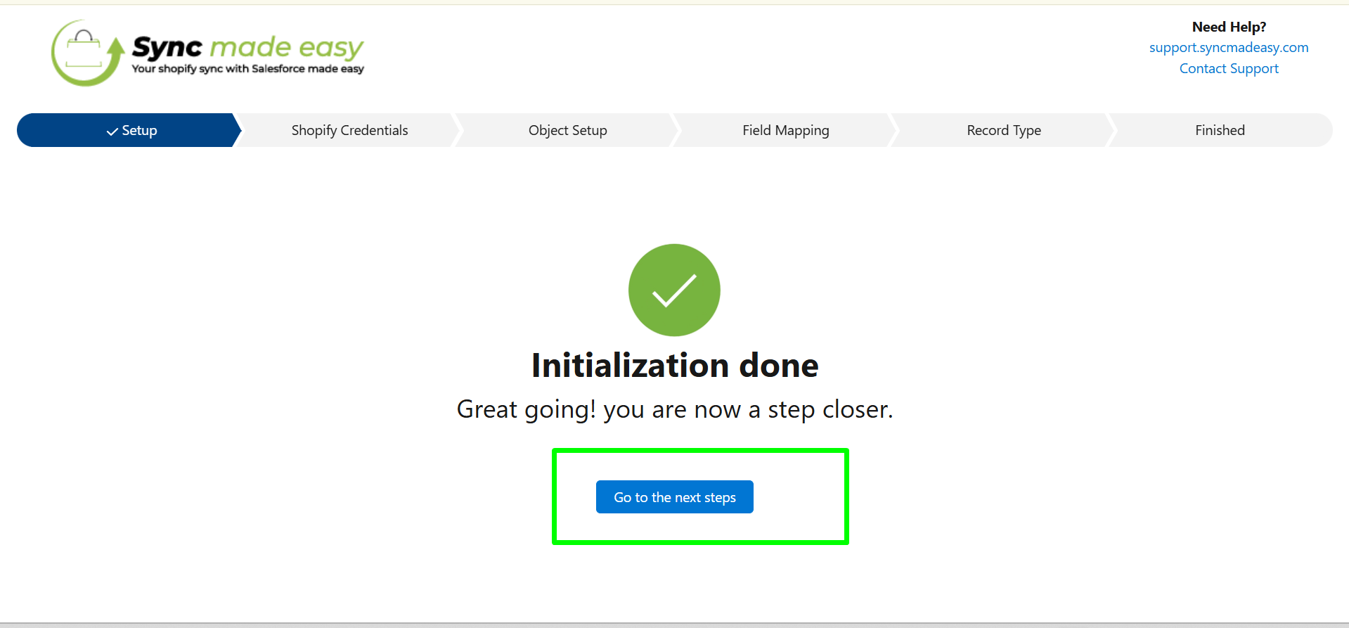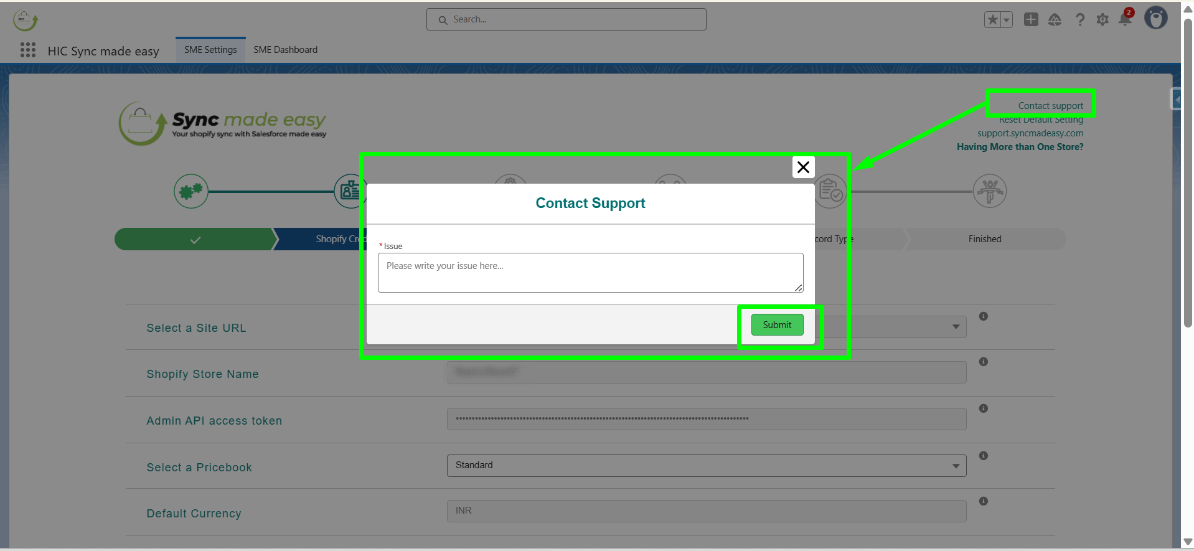 For further assistance or installation-related queries, click on Contact Support at the top right of each page to submit an issue, Or reach out to us at support@syncmadeasy.com.