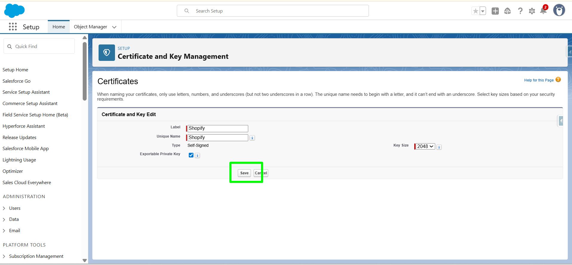 In this step, we will generate a self-signed certificate with the name “Shopify”.