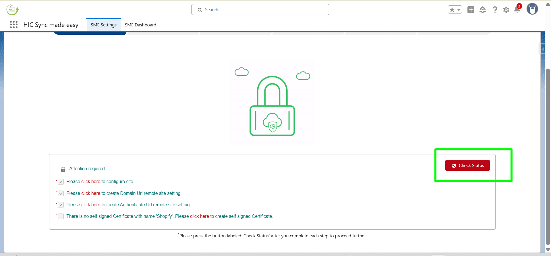 Now, Navigate to the Setup of the SME settings page, then click on Check Status .