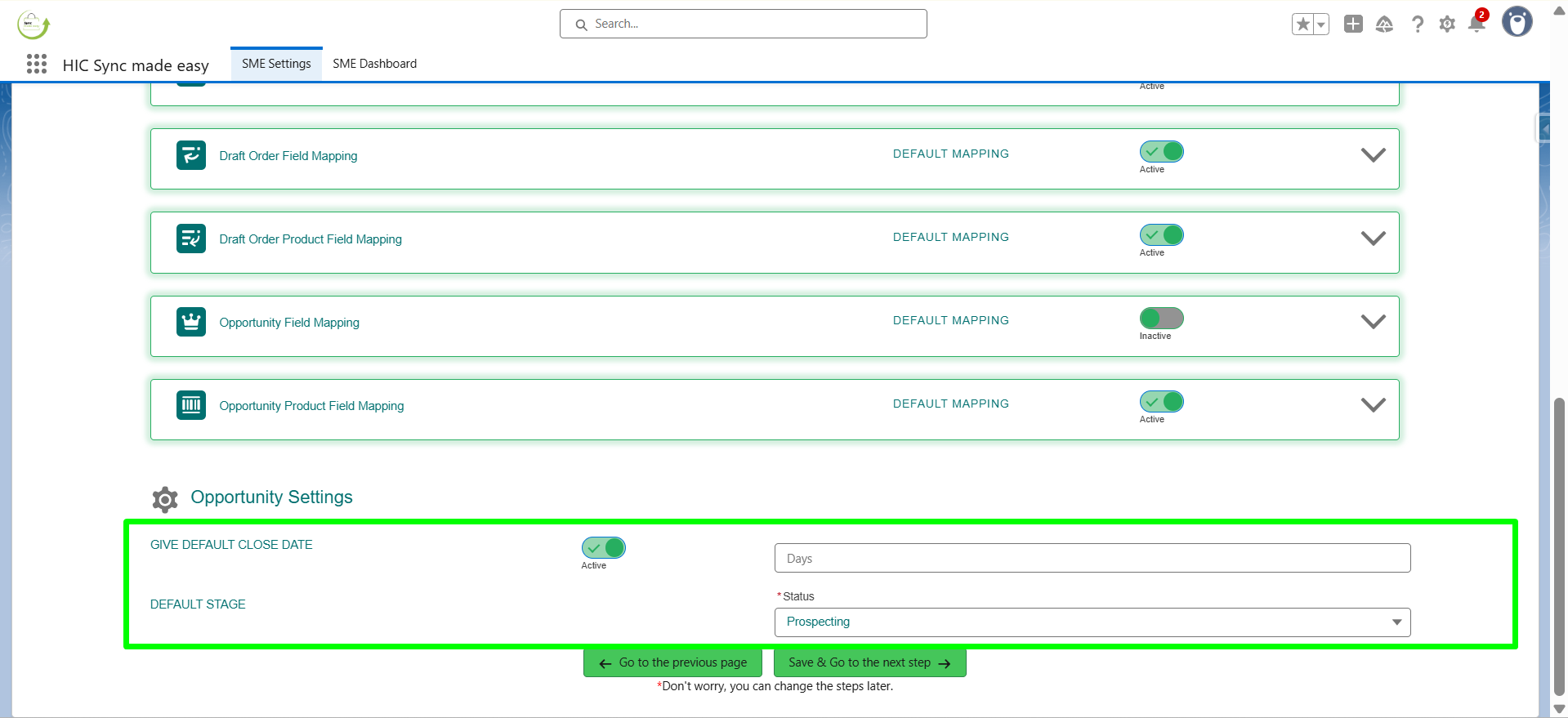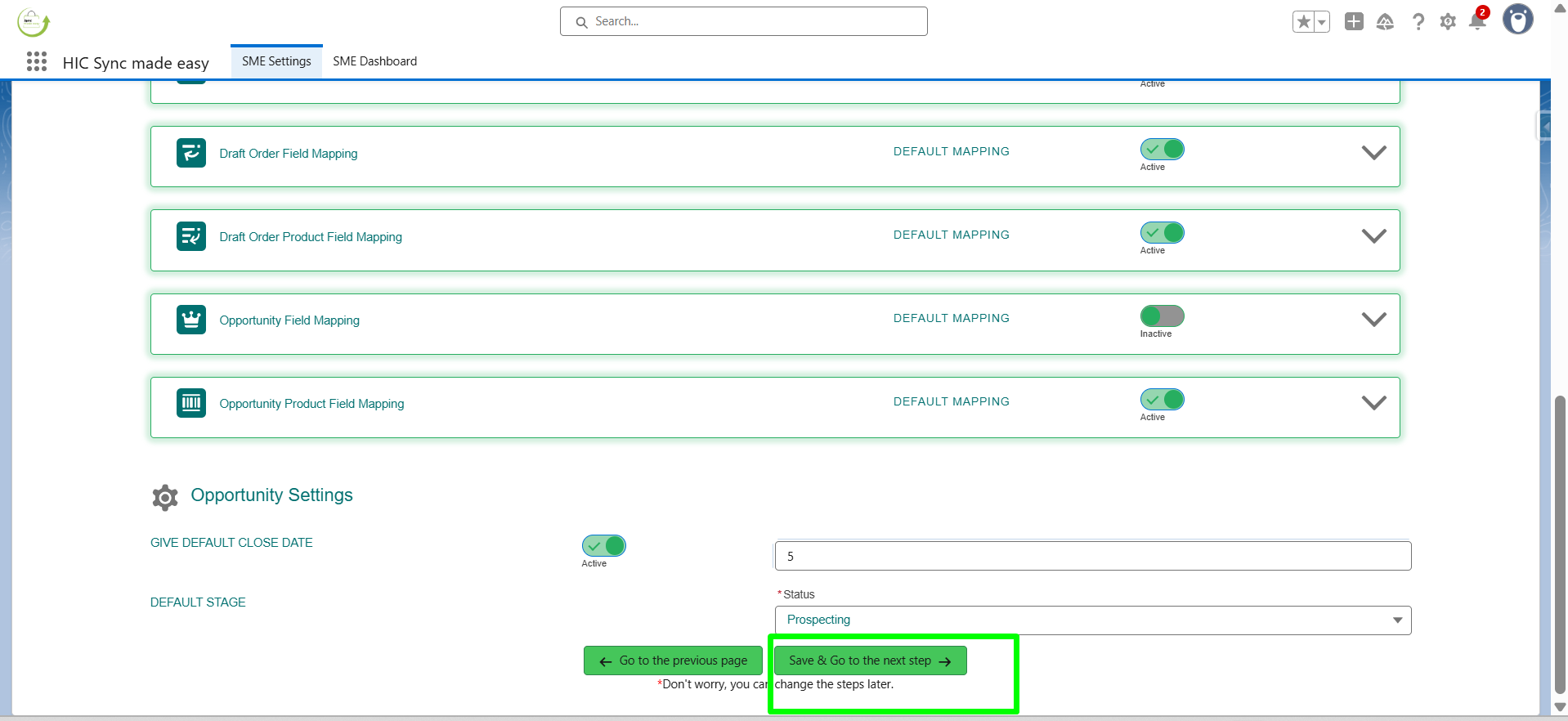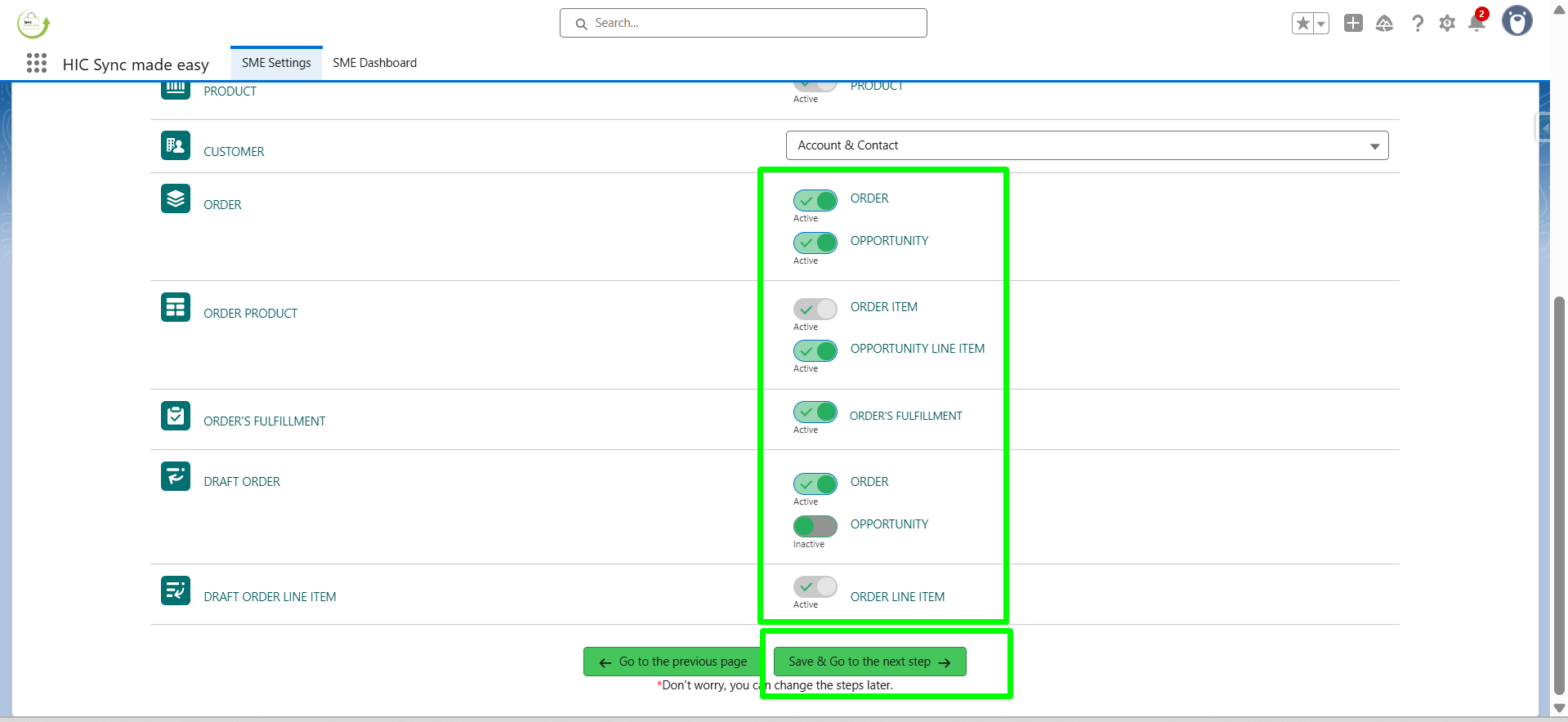 If you don’t want to create an Opportunity for orders, an Opportunity Line Item, or an Order Fulfillment, you can turn off the toggle for these objects. To use the full functionality, you can keep the default settings. Then, click on Save and Go to the Next Step.
