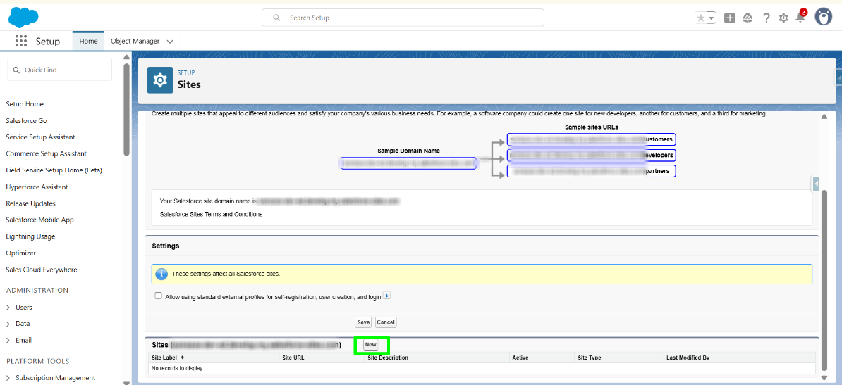 After a while, refreshing the page should display your Salesforce Site Domain Name. Click on “New” to create a new site.