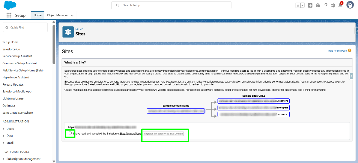Check the checkbox ☑️ next to I have read and accepted the Salesforce Site’s Terms and Conditions. Then, click Register My Salesforce Site Domain to finish registration.