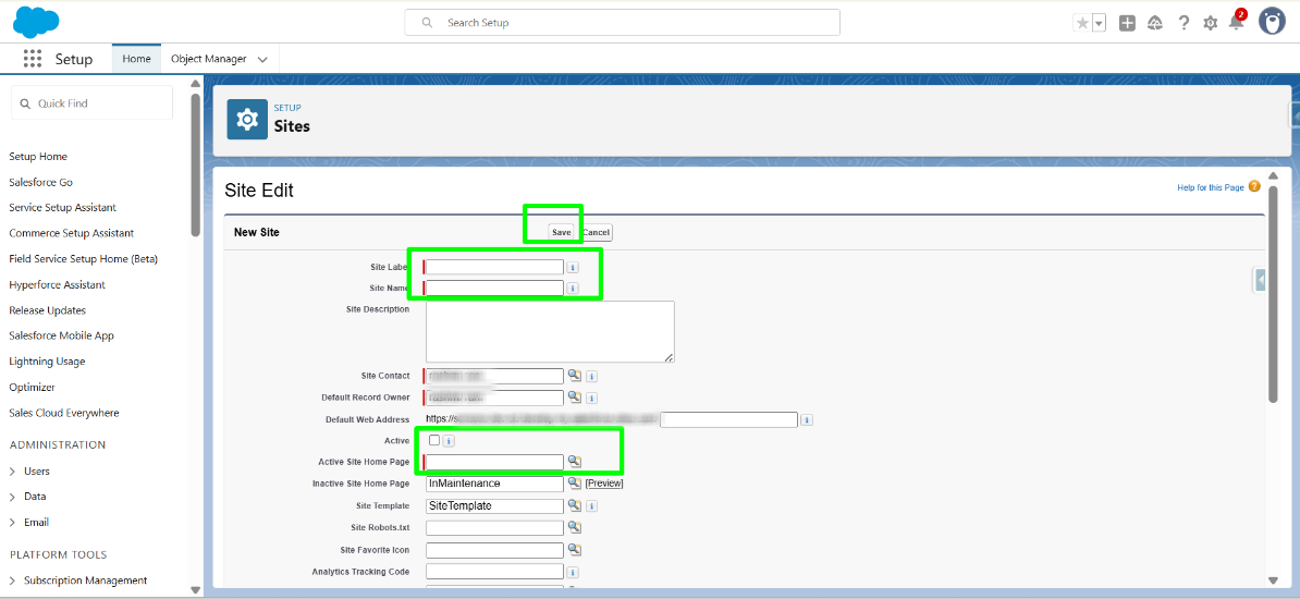 Now, on the Site Edit Page, fill in the mandatory fields marked in Green and tick the checkbox next to ‘Active’ to activate the site. (You only need to enter the Site Label and Site Name. And do not forget to put a tick on the Active Site Checkbox.)