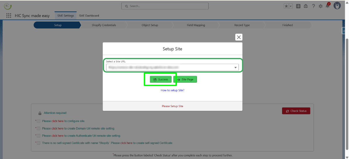 This will take you to the Setup Site webpage. From the dropdown, select your site URL and then click “Success”.