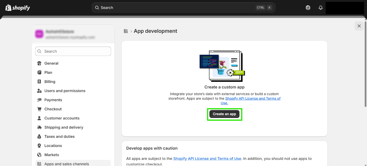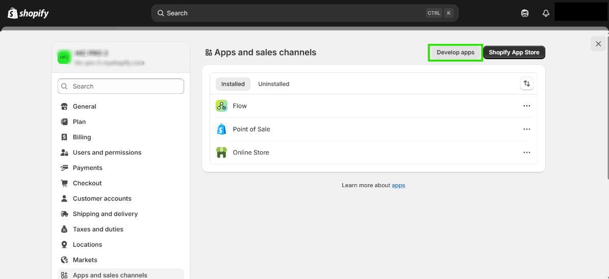 Step 4: After opening the Apps and Sales channel settings, click on “Develop Apps".
