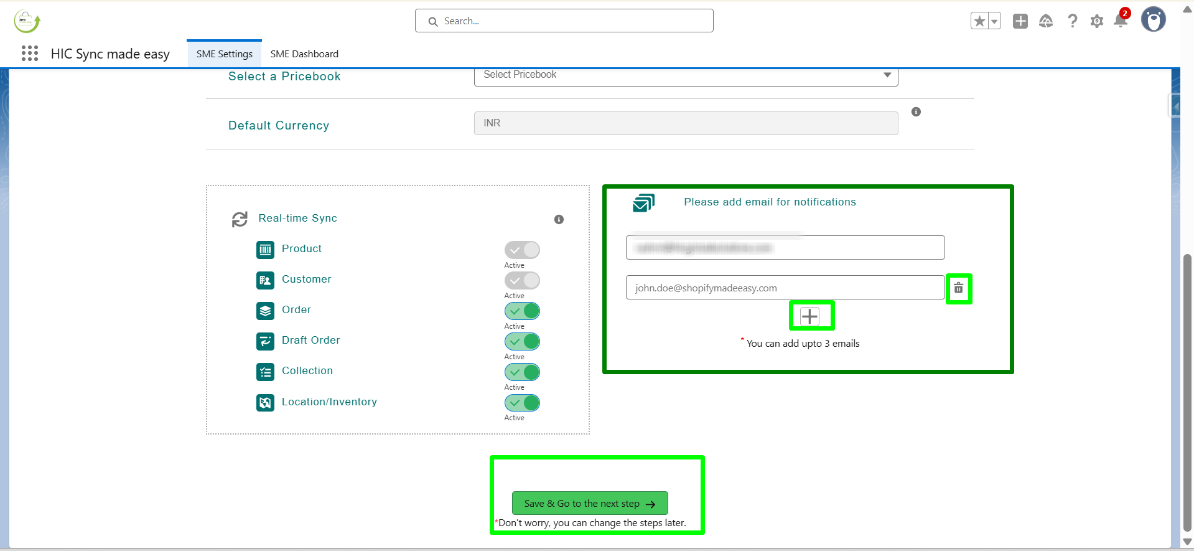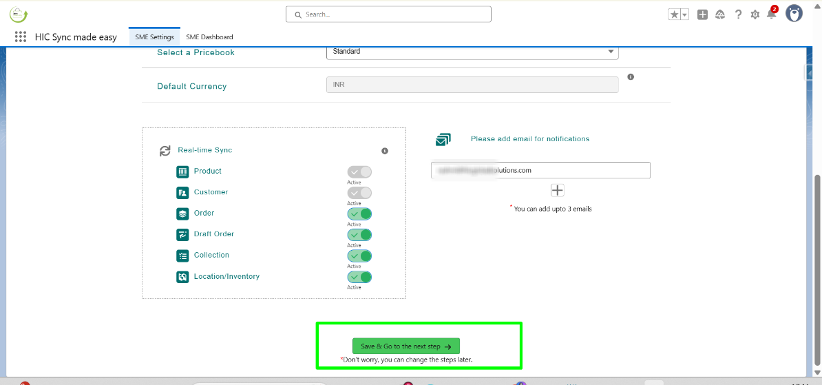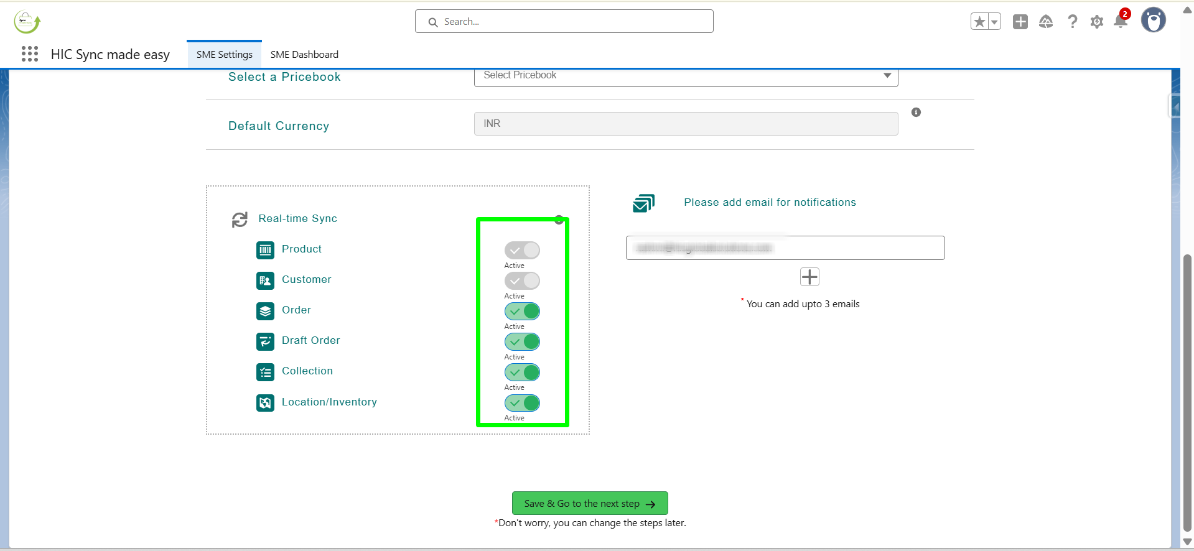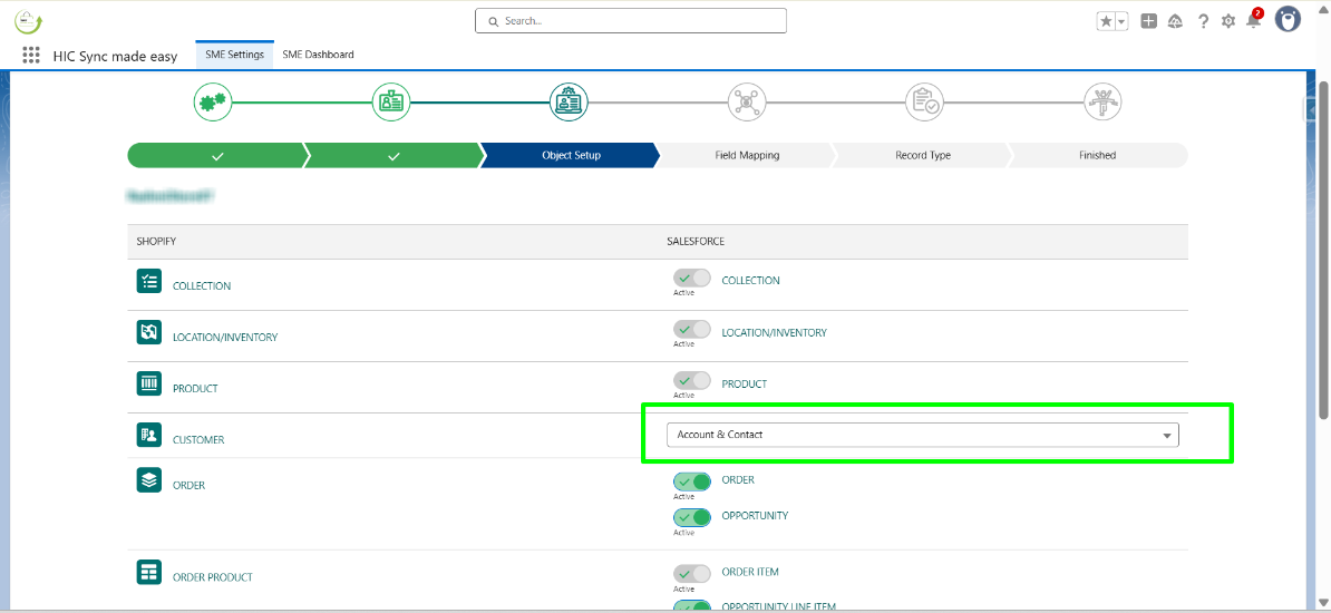 In this step, “Product” and “Customer” are default so you can’t change that, but if you want to disable the sync of other objects you can do that by turning off the toggle button .