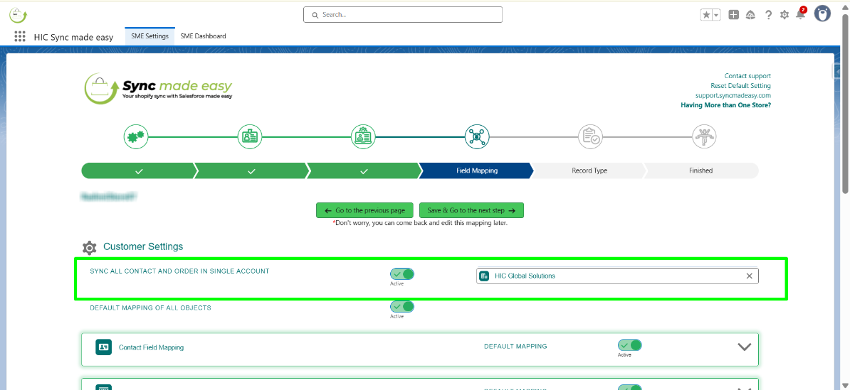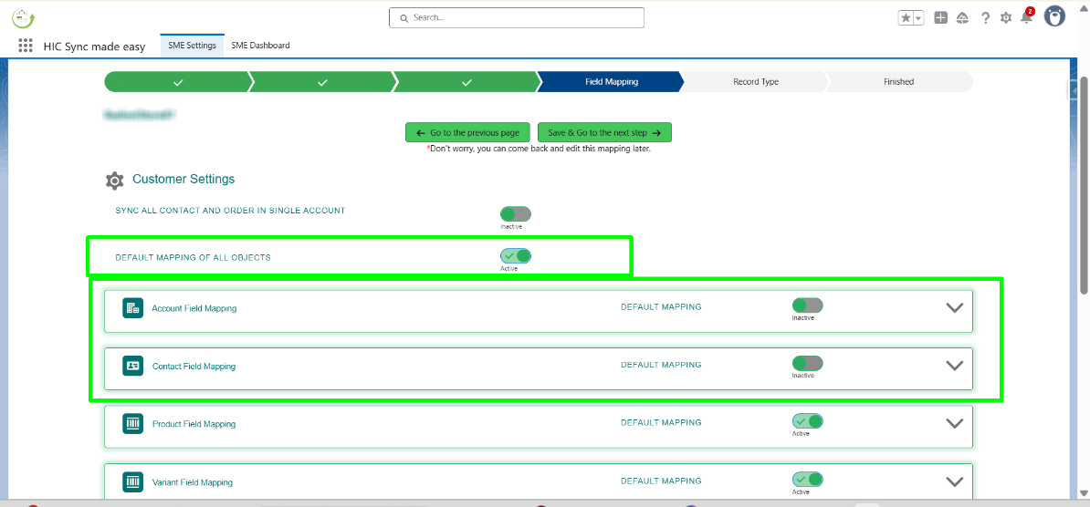 On the Field Mapping page, you can choose to use the default field mapping. Click Save and Go to Next Step. Sync Made Easy comes with a default field mapping that you can always use. If you want to customize the mapping, you can do so by turning off the toggle button.
