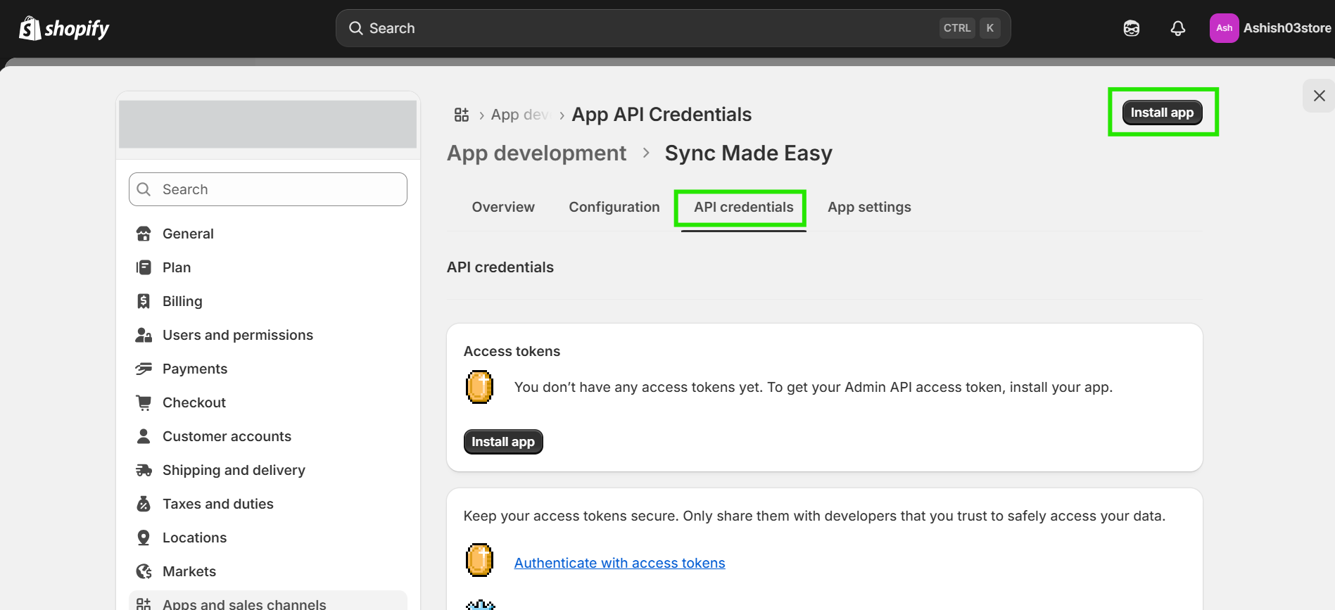 Step 12: Go to “API Credentials” and click on “Install app”.