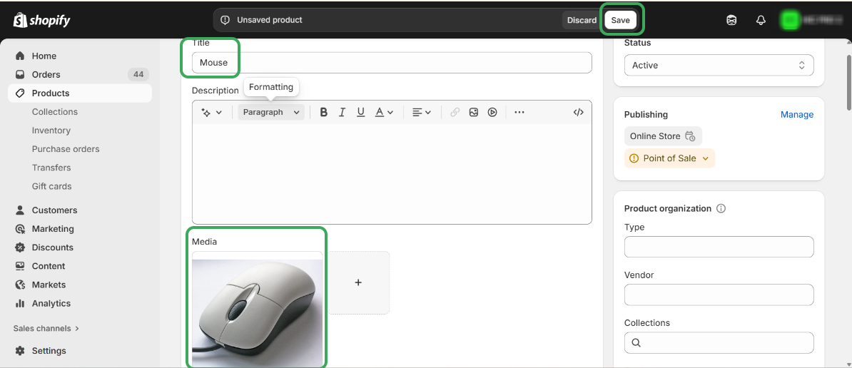 Step 4: Navigate to the Shopify store and create a new product, including an image and all required fields and then save it.