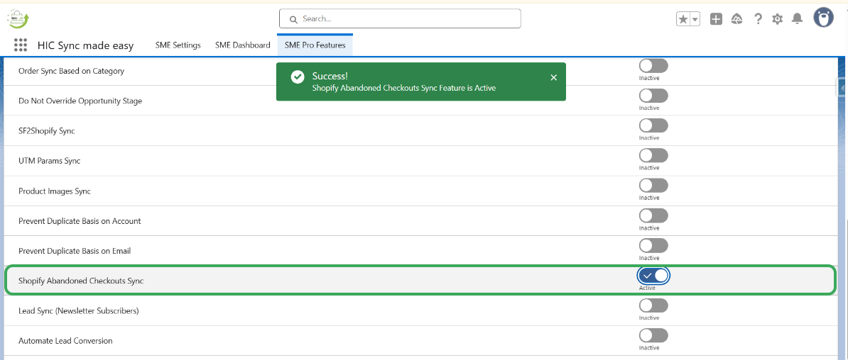 Step 3: Enable the “Shopify Abandoned Checkouts Sync” feature.
