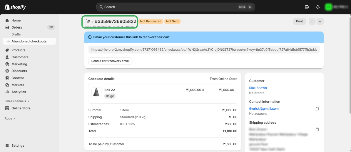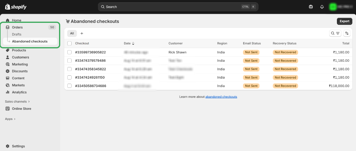 Step 7: After a few minutes, refresh the Abandoned Checkouts page in Shopify.