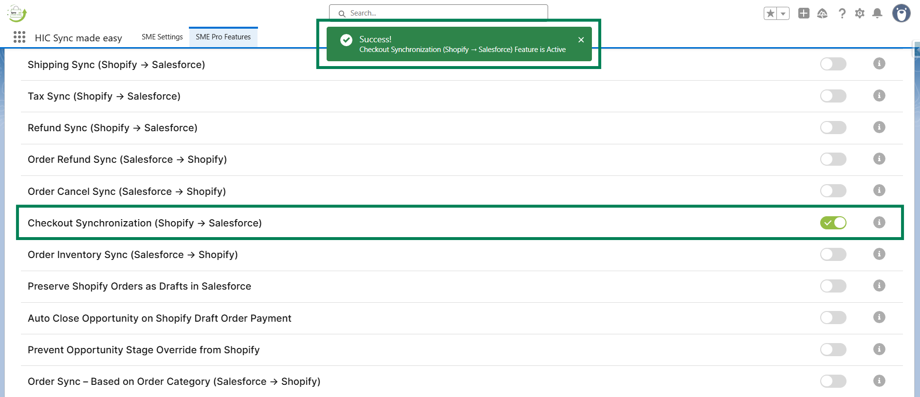 Step 3: Enable the “Checkout Synchronization (Shopify → Salesforce)” feature toggle button.
